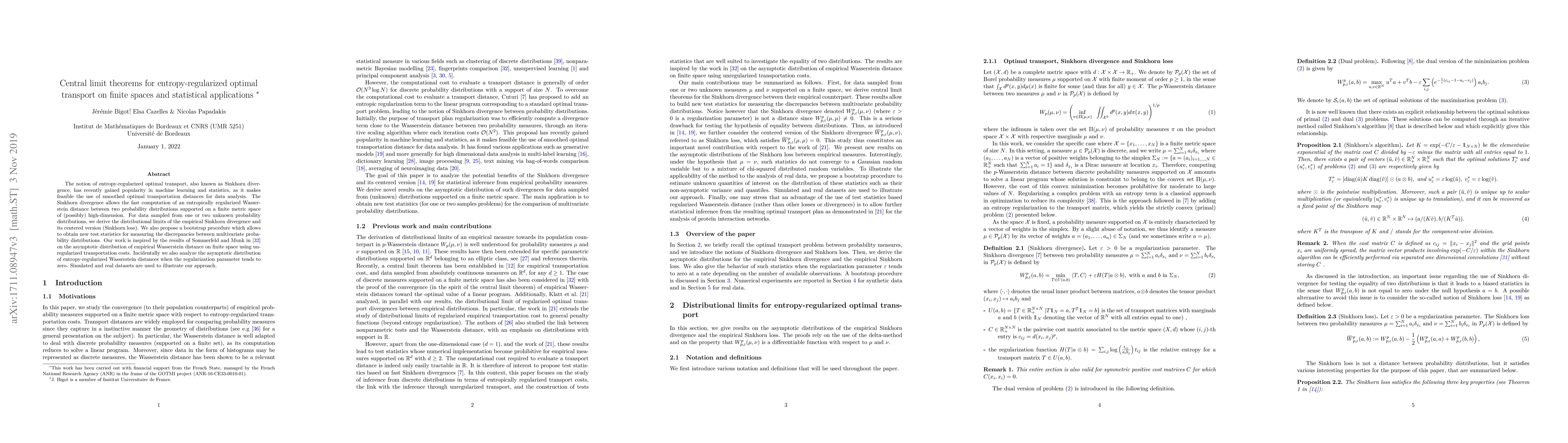 The notion of entropy-regularized optimal transport, also known as Sinkhorn divergence, has recently gained popularity in machine learning and statistics, as it makes feasible the use of smoothed optimal transportation distances for data analysis. The Sinkhorn divergence allows the fast computation of an entropically regularized Wasserstein distance between two probability distributions supported on a finite metric space of (possibly) high-dimension. For data sampled from one or two unknown probability distributions, we derive the distributional limits of the empirical Sinkhorn divergence and its centered version (Sinkhorn loss). We also propose a bootstrap procedure which allows to obtain new test statistics for measuring the discrepancies between multivariate probability distributions. Our work is inspired by the results of Sommerfeld and Munk (2016) on the asymptotic distribution of empirical Wasserstein distance on finite space using unregularized transportation costs. Incidentally we also analyze the asymptotic distribution of entropy-regularized Wasserstein distances when the regularization parameter tends to zero. Simulated and real datasets are used to illustrate our approach.