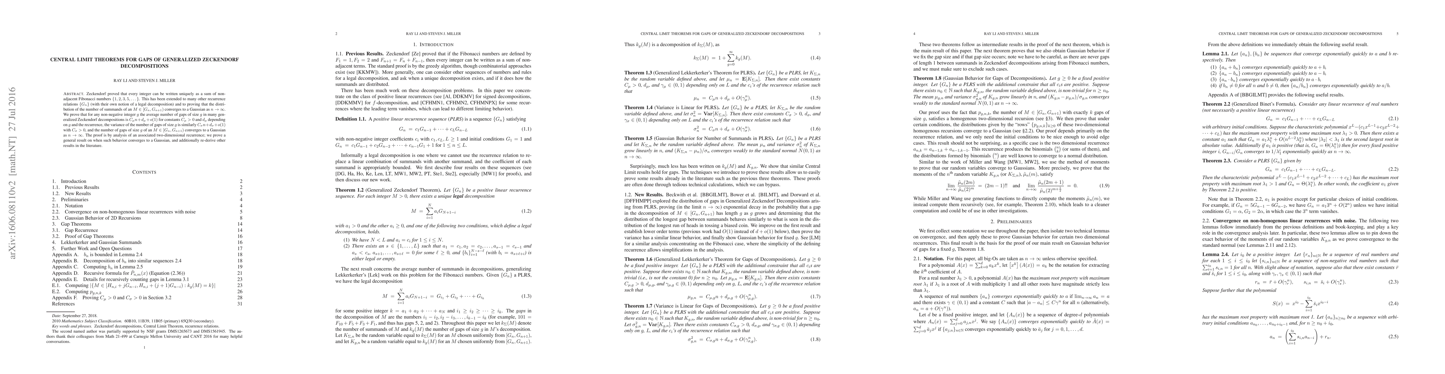 Zeckendorf proved that every integer can be written uniquely as a sum of non-adjacent Fibonacci numbers $\{1,2,3,5,\dots\}$. This has been extended to many other recurrence relations $\{G_n\}$ (with their own notion of a legal decomposition) and to proving that the distribution of the number of summands of an $M \in [G_n, G_{n+1})$ converges to a Gaussian as $n\to\infty$. We prove that for any non-negative integer $g$ the average number of gaps of size $g$ in many generalized Zeckendorf decompositions is $C_\mu n+d_\mu+o(1)$ for constants $C_\mu > 0$ and $d_\mu$ depending on $g$ and the recurrence, the variance of the number of gaps of size $g$ is similarly $C_\sigma n + d_\sigma + o(1)$ with $C_\sigma > 0$, and the number of gaps of size $g$ of an $M\in[G_n,G_{n+1})$ converges to a Gaussian as $n\to\infty$. The proof is by analysis of an associated two-dimensional recurrence; we prove a general result on when such behavior converges to a Gaussian, and additionally re-derive other results in the literature.