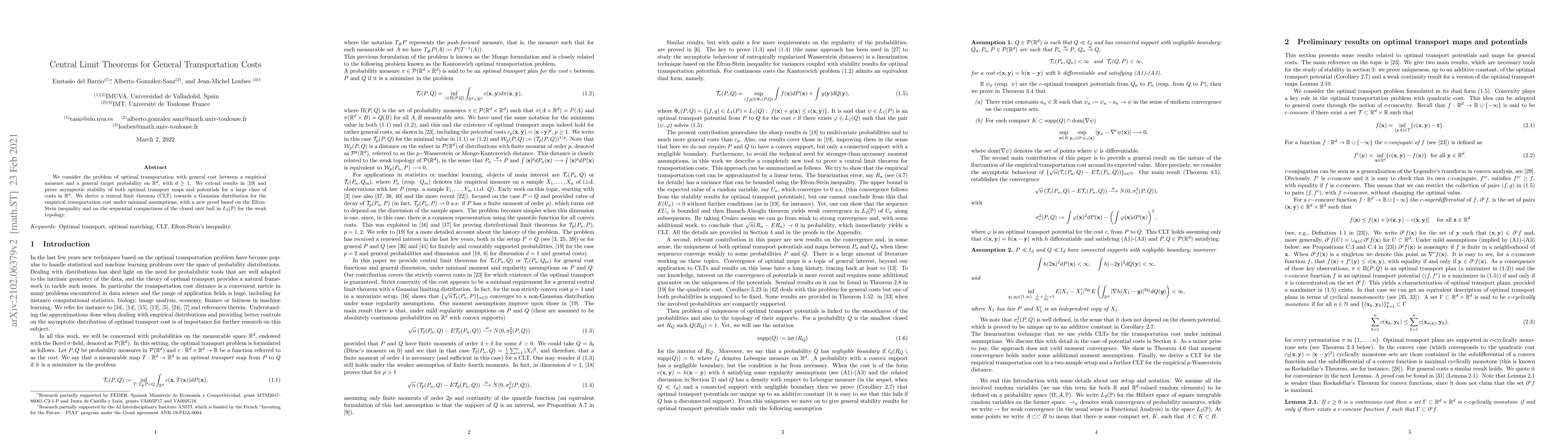 This paper extends optimal transportation theory to general costs, proving asymptotic stability of optimal transport maps and potentials. It derives a central limit theorem for empirical transportation costs, showing convergence to a Gaussian distribution under minimal assumptions, utilizing the Efron-Stein inequality and sequential compactness in L2(P).