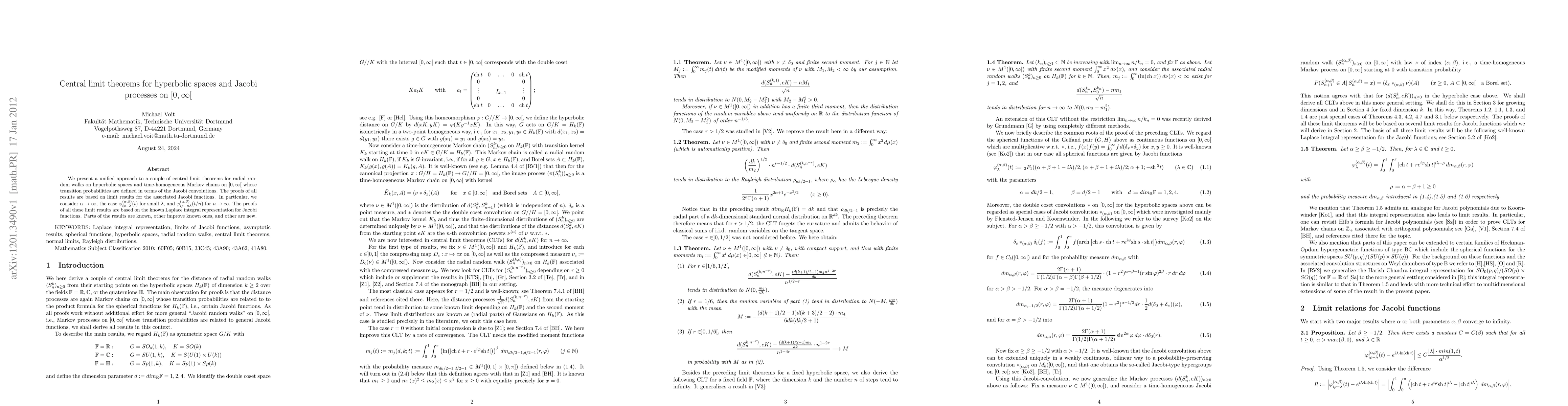 We present a unified approach to a couple of central limit theorems for radial random walks on hyperbolic spaces and time-homogeneous Markov chains on the positive half line whose transition probabilities are defined in terms of the Jacobi convolutions. The proofs of all results are based on limit results for the associated Jacobi functions. In particular, we consider the cases where the first parameter (i.e., the dimension of the hyperbolic space) tends to infinity as well as the cases $\phi_{i\rho-\lambda}^{(\alpha,\beta)}(t)$ for small $\lambda$, and $\phi_{i\rho-n\lambda}^{(\alpha,\beta)}(t/n)$ for $n\to\infty$. The proofs of all these limit results are based on the known Laplace integral representation for Jacobi functions. Parts of the limit results for Jacobi functions and of the CLTs are known, other improve known ones, and other are completely new.