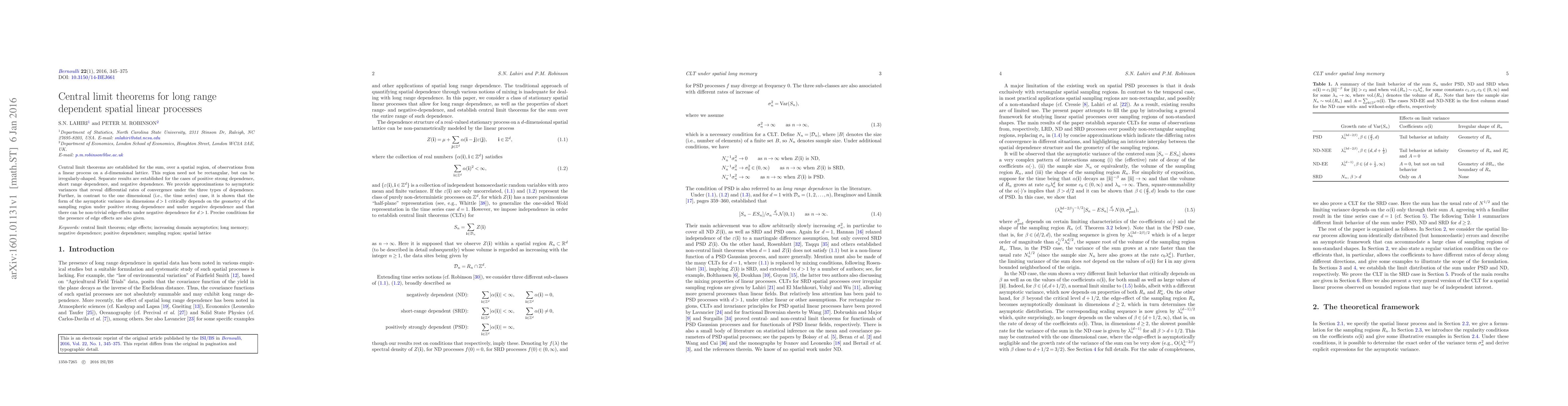 Central limit theorems are established for the sum, over a spatial region, of observations from a linear process on a $d$-dimensional lattice. This region need not be rectangular, but can be irregularly-shaped. Separate results are established for the cases of positive strong dependence, short range dependence, and negative dependence. We provide approximations to asymptotic variances that reveal differential rates of convergence under the three types of dependence. Further, in contrast to the one dimensional (i.e., the time series) case, it is shown that the form of the asymptotic variance in dimensions $d>1$ critically depends on the geometry of the sampling region under positive strong dependence and under negative dependence and that there can be non-trivial edge-effects under negative dependence for $d>1$. Precise conditions for the presence of edge effects are also given.