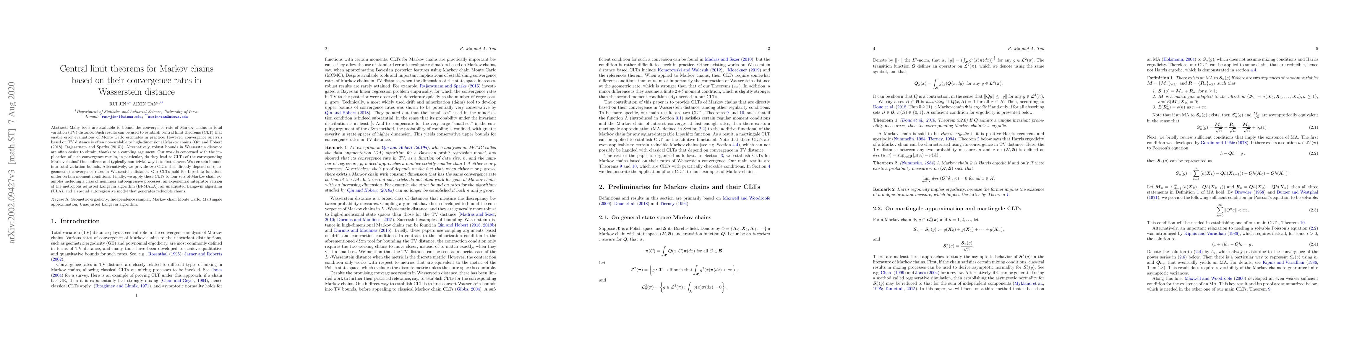 This paper investigates central limit theorems (CLTs) for Markov chains based on their convergence rates in Wasserstein distance, providing direct CLTs dependent on Wasserstein convergence instead of converting them to total variation bounds. It demonstrates applicability to various Markov chain examples, including nonlinear autoregressive processes and different versions of the Langevin algorithm.
