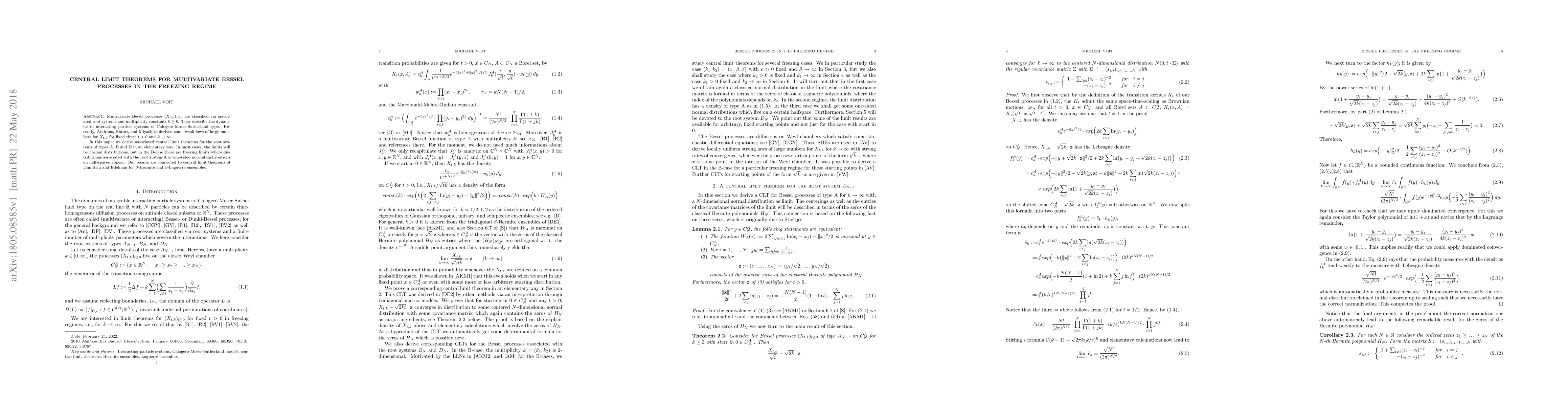 This paper derives central limit theorems for multivariate Bessel processes in the freezing regime, focusing on root systems of types A, B, and D. While normal distributions are the typical limits, the B-case exhibits freezing limits with distributions linked to root system A or one-sided normal distributions. The results connect to central limit theorems of beta-Hermite and beta-Laguerre ensembles.