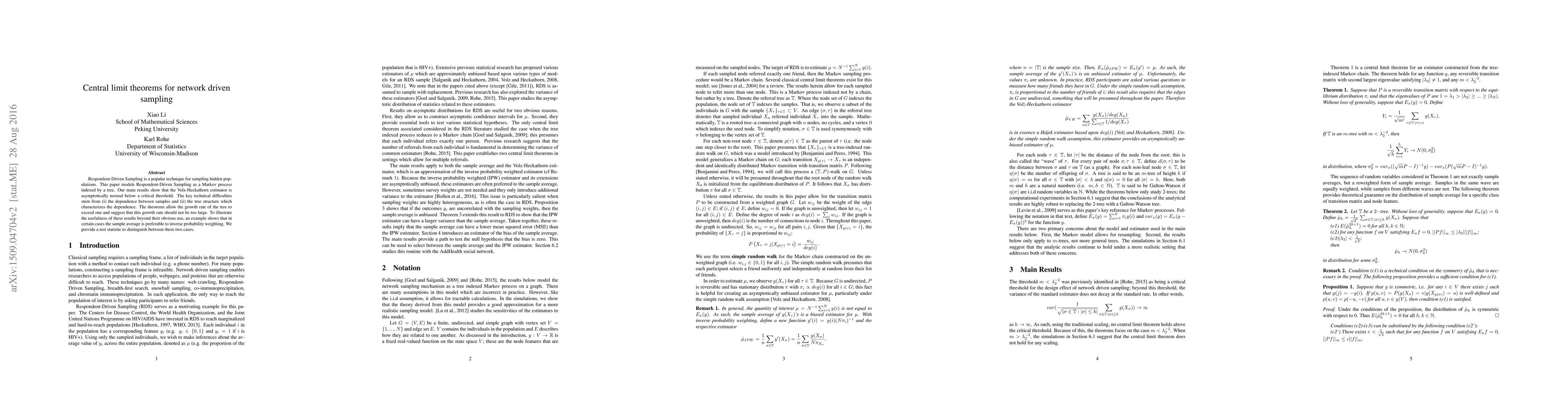 Respondent-Driven Sampling is a popular technique for sampling hidden populations. This paper models Respondent-Driven Sampling as a Markov process indexed by a tree. Our main results show that the Volz-Heckathorn estimator is asymptotically normal below a critical threshold. The key technical difficulties stem from (i) the dependence between samples and (ii) the tree structure which characterizes the dependence. The theorems allow the growth rate of the tree to exceed one and suggest that this growth rate should not be too large. To illustrate the usefulness of these results beyond their obvious use, an example shows that in certain cases the sample average is preferable to inverse probability weighting. We provide a test statistic to distinguish between these two cases.