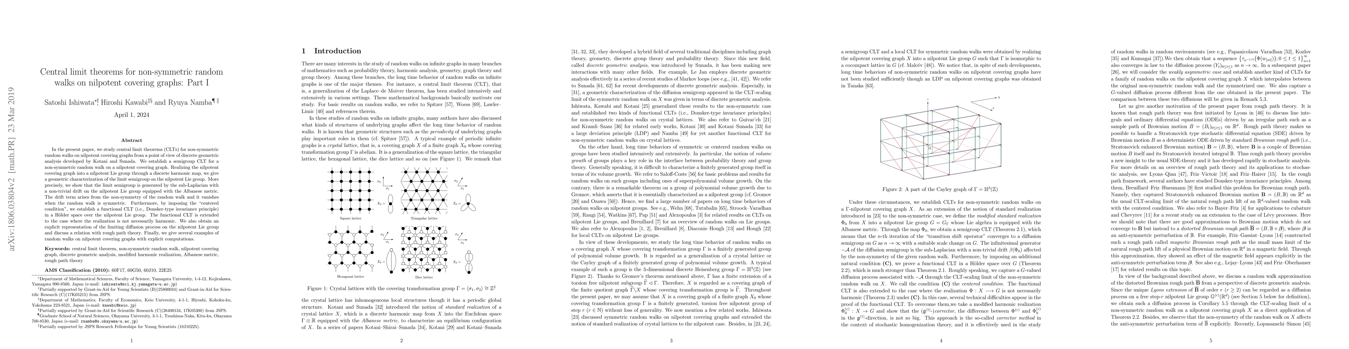 In the present paper, we study central limit theorems (CLTs) for non-symmetric random walks on nilpotent covering graphs from a point of view of discrete geometric analysis developed by Kotani and Sunada. We establish a semigroup CLT for a non-symmetric random walk on a nilpotent covering graph. Realizing the nilpotent covering graph into a nilpotent Lie group through a discrete harmonic map, we give a geometric characterization of the limit semigroup on the nilpotent Lie group. More precisely, we show that the limit semigroup is generated by the sub-Laplacian with a non-trivial drift on the nilpotent Lie group equipped with the Albanese metric. The drift term arises from the non-symmetry of the random walk and it vanishes when the random walk is symmetric. Furthermore, by imposing the "centered condition", we establish a functional CLT (i.e., Donsker-type invariance principle) in a Hoelder space over the nilpotent Lie group. The functional CLT is extended to the case where the realization is not necessarily harmonic. We also obtain an explicit representation of the limiting diffusion process on the nilpotent Lie group and discuss a relation with rough path theory. Finally, we give several examples of random walks on nilpotent covering graphs with explicit computations.