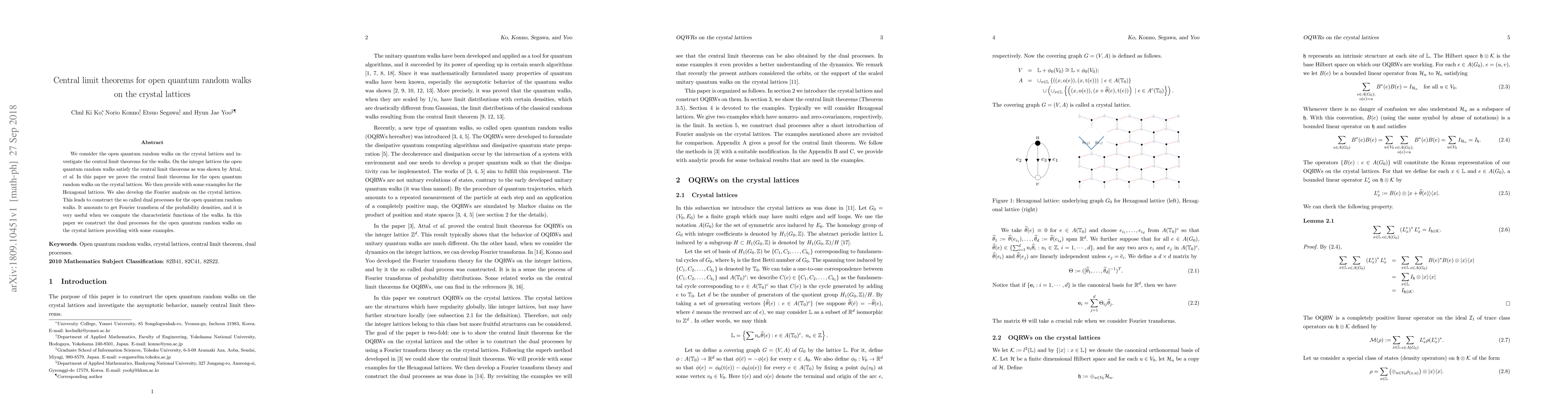 We consider the open quantum random walks on the crystal lattices and investigate the central limit theorems for the walks. On the integer lattices the open quantum random walks satisfy the central limit theorems as was shown by Attal, {\it et al}. In this paper we prove the central limit theorems for the open quantum random walks on the crystal lattices. We then provide with some examples for the Hexagonal lattices. We also develop the Fourier analysis on the crystal lattices. This leads to construct the so called dual processes for the open quantum random walks. It amounts to get Fourier transform of the probability densities, and it is very useful when we compute the characteristic functions of the walks. In this paper we construct the dual processes for the open quantum random walks on the crystal lattices providing with some examples.