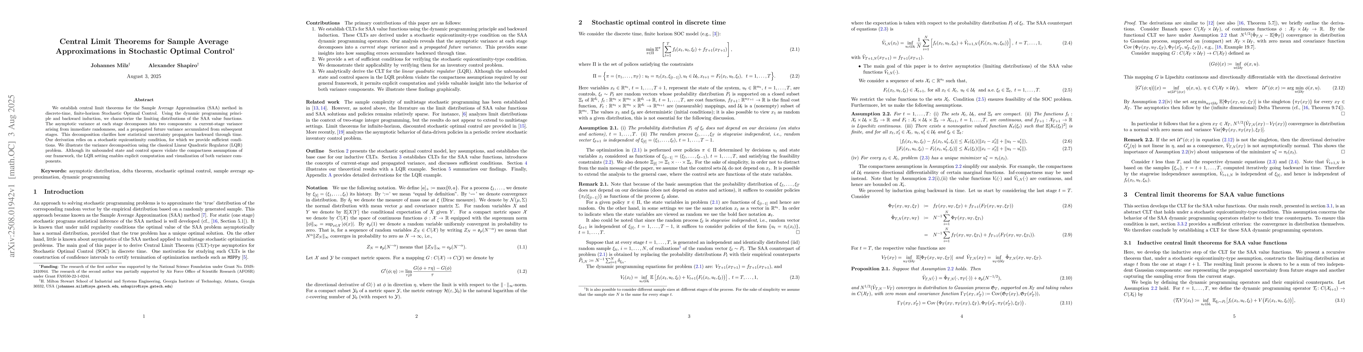 We establish central limit theorems for the Sample Average Approximation (SAA) method in discrete-time, finite-horizon Stochastic Optimal Control. Using the dynamic programming principle and backward induction, we characterize the limiting distributions of the SAA value functions. The asymptotic variance at each stage decomposes into two components: a current-stage variance arising from immediate randomness, and a propagated future variance accumulated from subsequent stages. This decomposition clarifies how statistical uncertainty propagates backward through time. Our derivation relies on a stochastic equicontinuity condition, for which we provide sufficient conditions. We illustrate the variance decomposition using the classical Linear Quadratic Regulator (LQR) problem. Although its unbounded state and control spaces violate the compactness assumptions of our framework, the LQR setting enables explicit computation and visualization of both variance components.