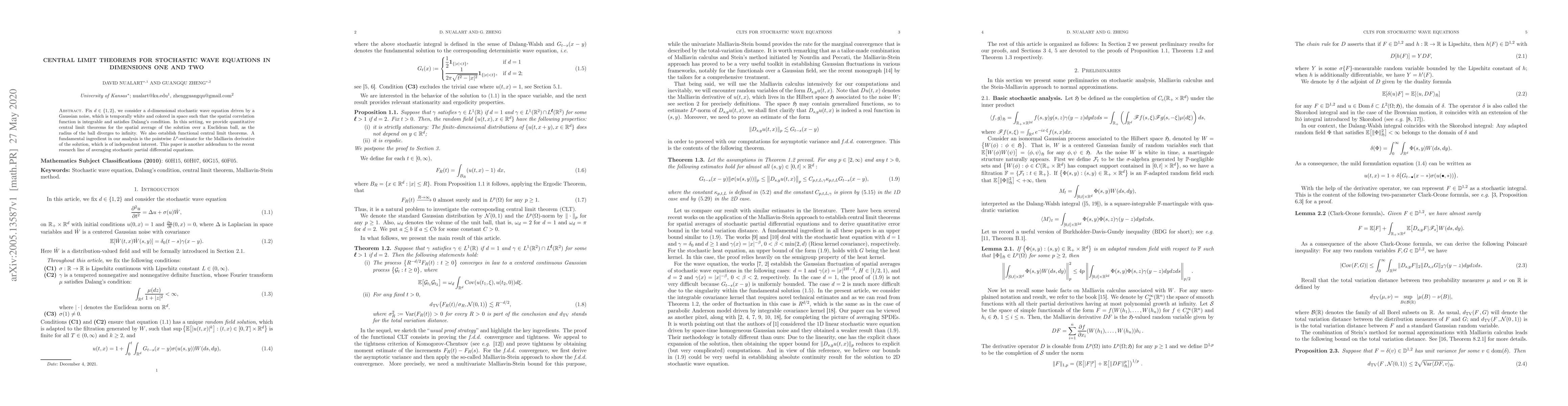 This paper investigates central limit theorems for stochastic wave equations in one and two dimensions driven by Gaussian noise, establishing quantitative results for the spatial average of the solution. It also provides functional central limit theorems and uses Malliavin derivative $L^p$-estimates as a key analytical tool.
