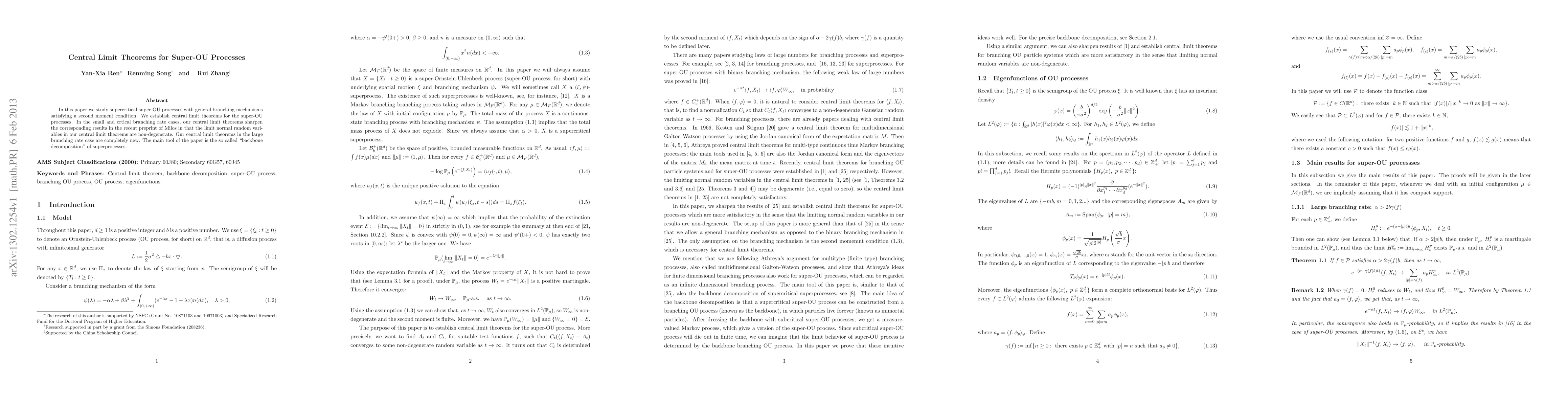 In this paper we study supercritical super-OU processes with general branching mechanisms satisfying a second moment condition. We establish central limit theorems for the super-OU processes. In the small and crtical branching rate cases, our central limit theorems sharpen the corresponding results in the recent preprint of Milos in that the limit normal random variables in our central limit theorems are non-degenerate. Our central limit theorems in the large branching rate case are completely new. The main tool of the paper is the so called "backbone decomposition" of superprocesses.