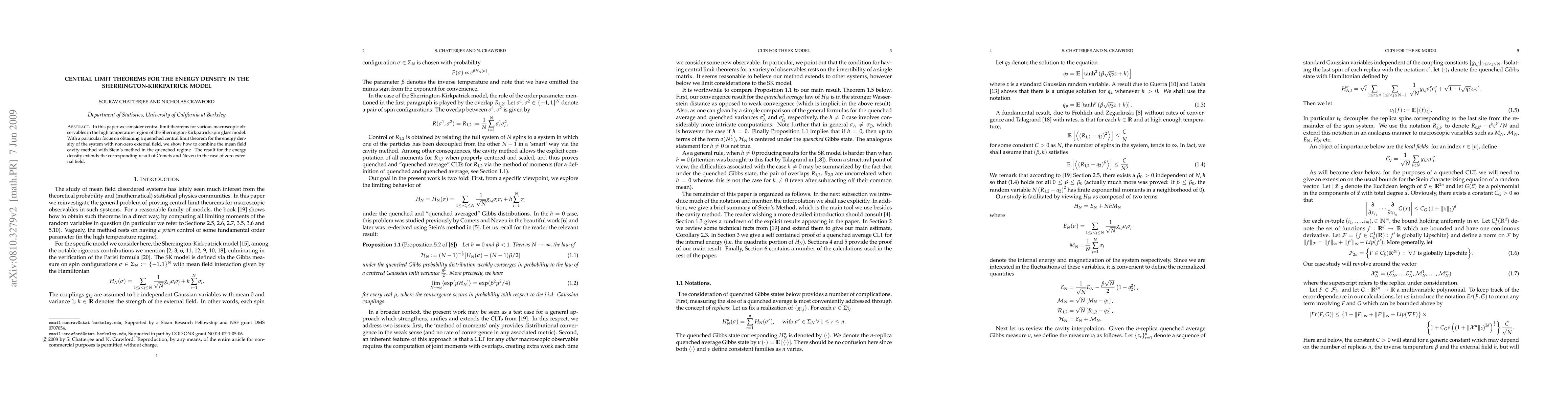 In this paper we consider central limit theorems for various macroscopic observables in the high temperature region of the Sherrington-Kirkpatrick spin glass model. With a particular focus on obtaining a quenched central limit theorem for the energy density of the system with non-zero external field, we show how to combine the mean field cavity method with Stein's method in the quenched regime. The result for the energy density extends the corresponding result of Comets-Neveu.