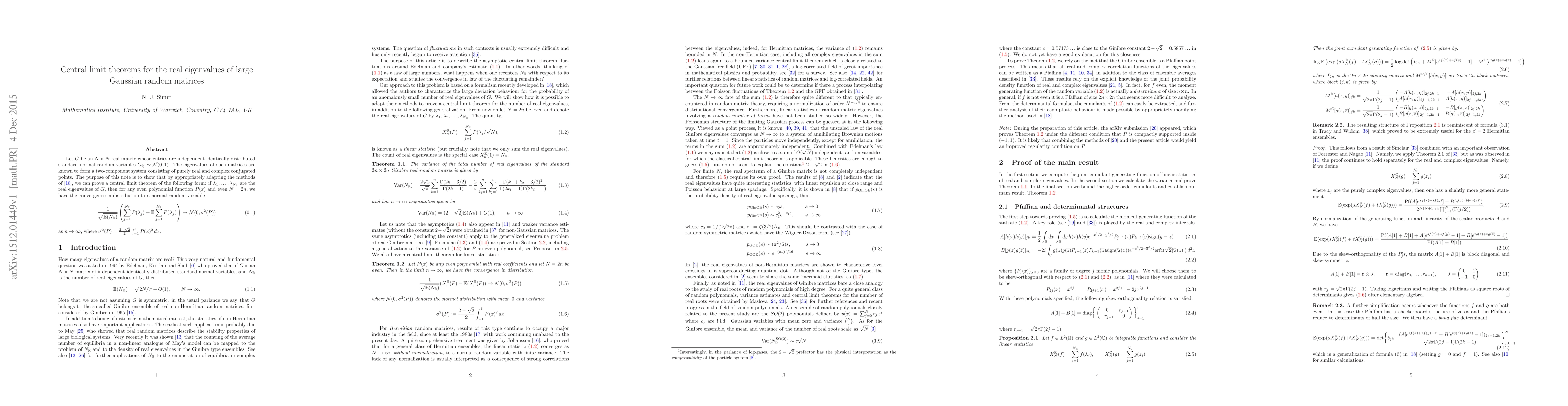 The paper proves a central limit theorem for real eigenvalues of large Gaussian random matrices, showing convergence in distribution to a normal random variable as the matrix size increases.