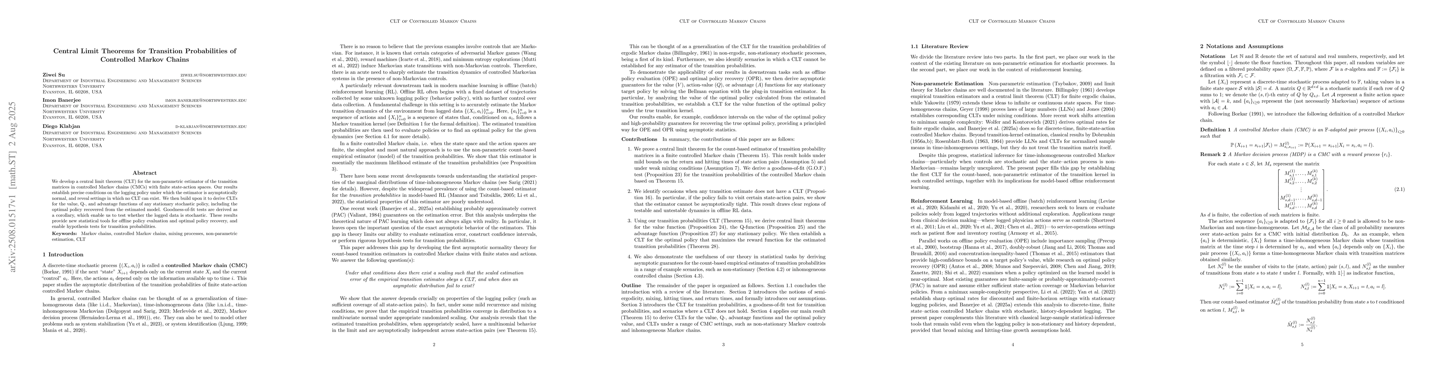 We develop a central limit theorem (CLT) for the non-parametric estimator of the transition matrices in controlled Markov chains (CMCs) with finite state-action spaces. Our results establish precise conditions on the logging policy under which the estimator is asymptotically normal, and reveal settings in which no CLT can exist. We then build upon it to derive CLTs for the value, Q-, and advantage functions of any stationary stochastic policy, including the optimal policy recovered from the estimated model. Goodness-of-fit tests are derived as a corollary, which enable us to test whether the logged data is stochastic. These results provide new statistical tools for offline policy evaluation and optimal policy recovery, and enable hypothesis tests for transition probabilities.