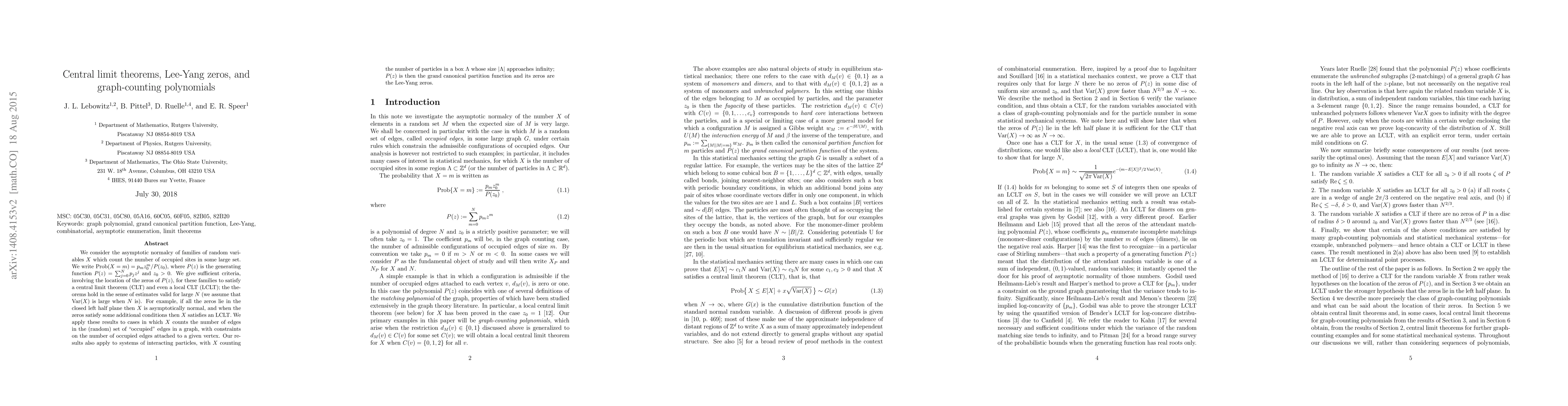 We consider the asymptotic normalcy of families of random variables $X$ which count the number of occupied sites in some large set. We write $Prob(X=m)=p_mz_0^m/P(z_0)$, where $P(z)$ is the generating function $P(z)=\sum_{j=0}^{N}p_jz^j$ and $z_0>0$. We give sufficient criteria, involving the location of the zeros of $P(z)$, for these families to satisfy a central limit theorem (CLT) and even a local CLT (LCLT); the theorems hold in the sense of estimates valid for large $N$ (we assume that $Var(X)$ is large when $N$ is). For example, if all the zeros lie in the closed left half plane then $X$ is asymptotically normal, and when the zeros satisfy some additional conditions then $X$ satisfies an LCLT. We apply these results to cases in which $X$ counts the number of edges in the (random) set of "occupied" edges in a graph, with constraints on the number of occupied edges attached to a given vertex. Our results also apply to systems of interacting particles, with $X$ counting the number of particles in a box $\Lambda$ whose size approaches infinity; $P(z)$ is then the grand canonical partition function and its zeros are the Lee-Yang zeros.
