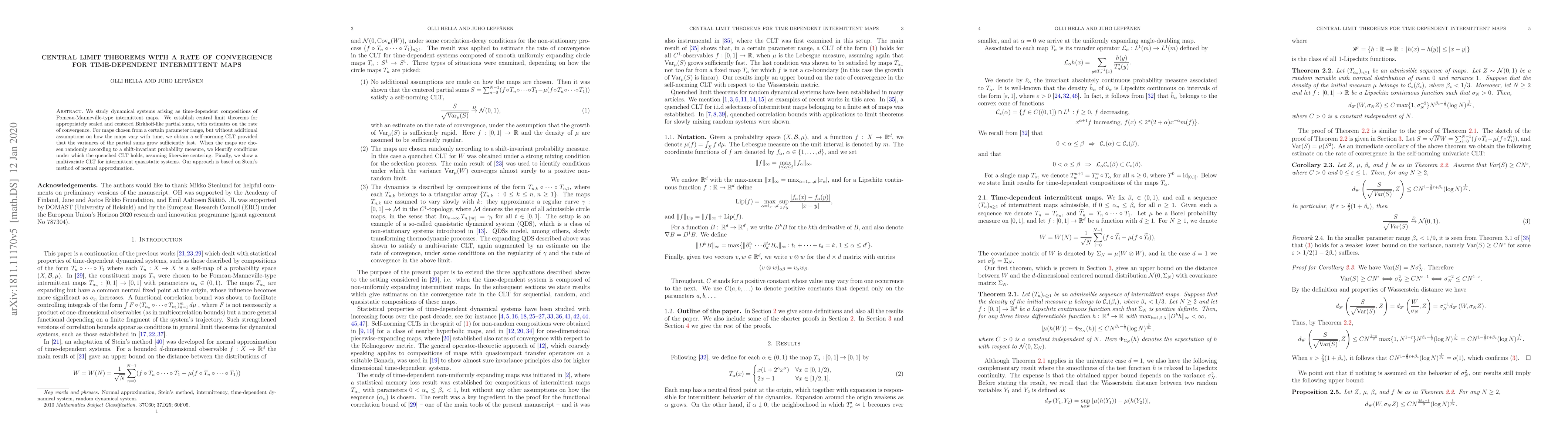 This paper establishes central limit theorems (CLT) for time-dependent intermittent maps, including self-normalized and multivariate CLTs, with estimates on convergence rates. The study utilizes Stein's method of normal approximation to derive results for both deterministic and random map selections.