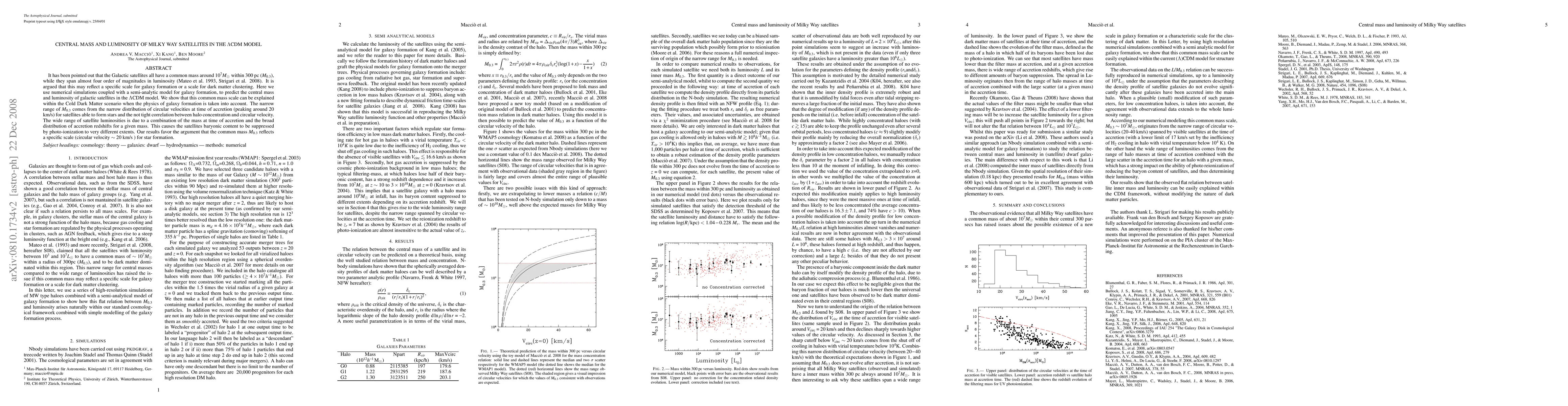 Numerical simulations suggest that Milky Way satellites have a common mass scale due to star formation at specific circular velocities, while varying luminosity is caused by differences in accretion redshifts and baryonic content suppression.