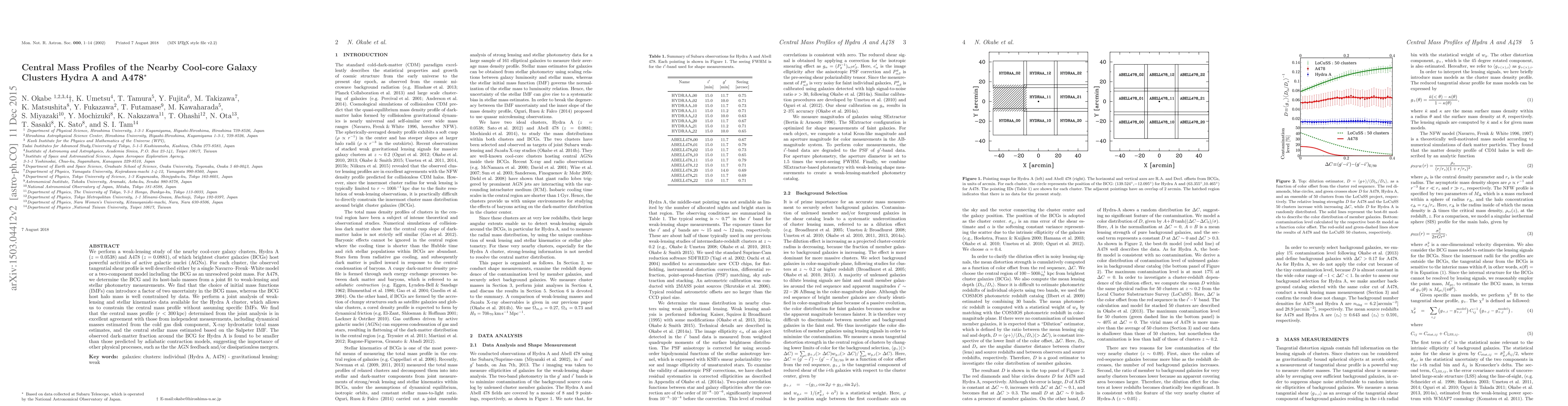 This study uses weak-lensing to analyze the central mass profiles of the cool-core galaxy clusters Hydra A and A478. The research finds that the central mass profile of Hydra A is consistent with various independent measurements, indicating the influence of AGN feedback and mergers on dark matter distribution.