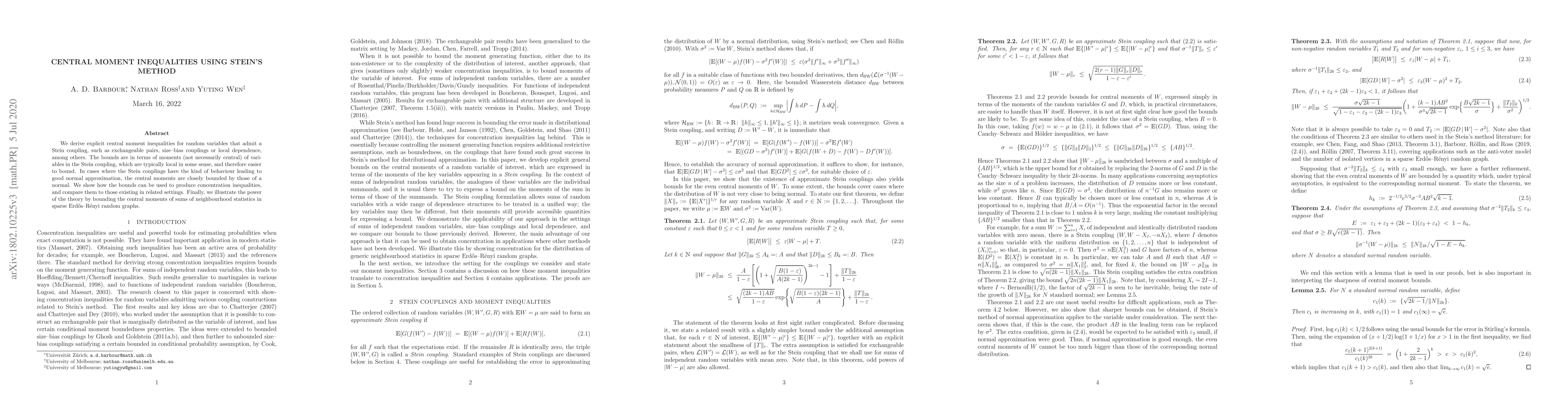 We derive explicit central moment inequalities for random variables that admit a Stein coupling, such as exchangeable pairs, size--bias couplings or local dependence, among others. The bounds are in terms of moments (not necessarily central) of variables in the Stein coupling, which are typically local in some sense, and therefore easier to bound. In cases where the Stein couplings have the kind of behaviour leading to good normal approximation, the central moments are closely bounded by those of a normal. We show how the bounds can be used to produce concentration inequalities, and compare them to those existing in related settings. Finally, we illustrate the power of the theory by bounding the central moments of sums of neighbourhood statistics in sparse Erd\H{o}s--R\'enyi random graphs.
