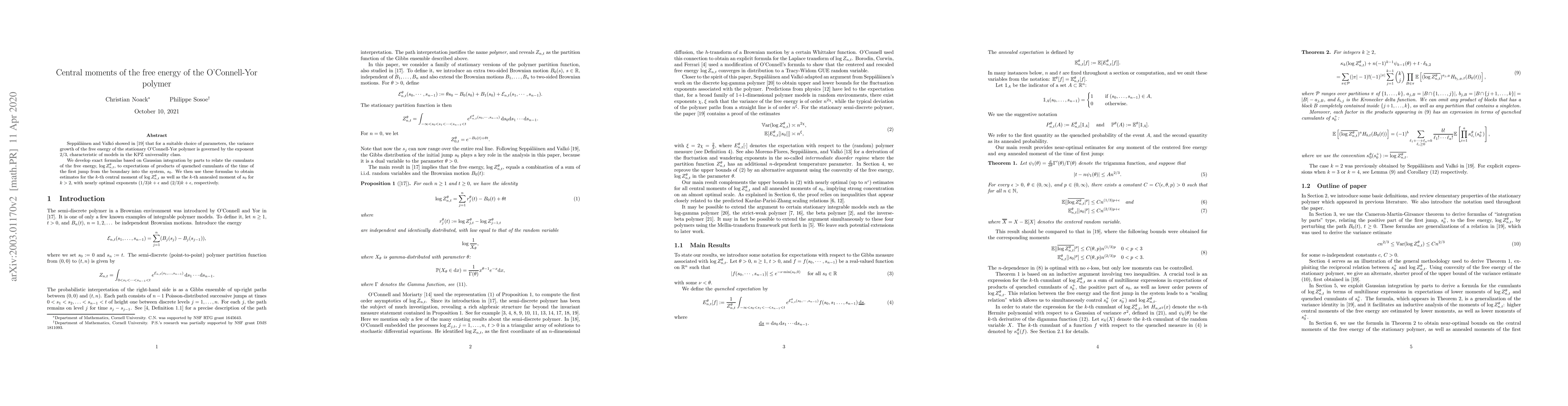 Sepp\"al\"ainen and Valk\'o showed in \cite{SV} that for a suitable choice of parameters, the variance growth of the free energy of the stationary O'Connell-Yor polymer is governed by the exponent $2/3$, characteristic of models in the KPZ universality class. We develop exact formulas based on Gaussian integration by parts to relate the cumulants of the free energy, $\log Z_{n,t}^\theta$, to expectations of products of quenched cumulants of the time of the first jump from the boundary into the system, $s_0$. We then use these formulas to obtain estimates for the $k$-th central moment of $\log Z_{n,t}^\theta$ as well as the $k$-th annealed moment of $s_0$ for $k> 2$, with nearly optimal exponents $(1/3)k+\epsilon$ and $(2/3)k+\epsilon$, respectively.