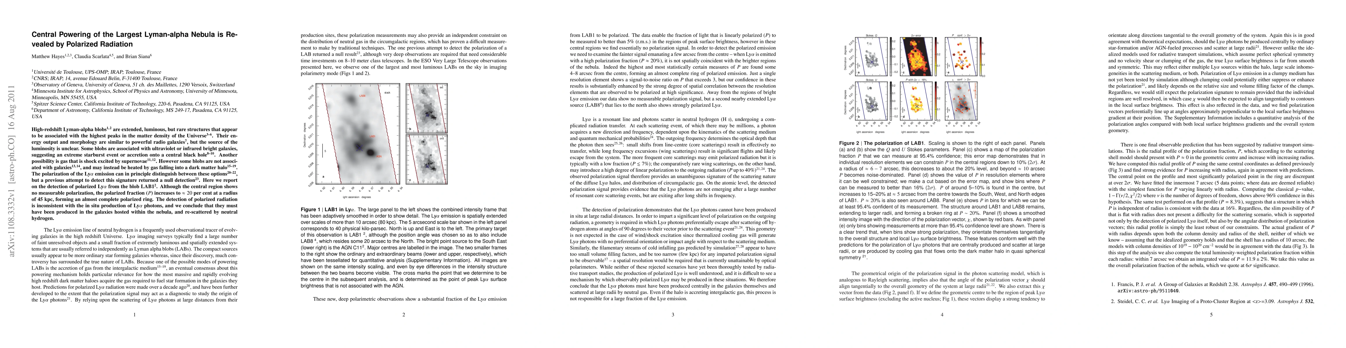 This paper reveals that the central powering of the largest Lyman-alpha nebula, LAB1, is indicated by the detection of polarized Ly-alpha radiation, suggesting that Ly-alpha photons originate from galaxies within the nebula and are re-scattered by neutral hydrogen. The polarized ring formation at 45 kpc radius rules out in situ production of Ly-alpha photons.