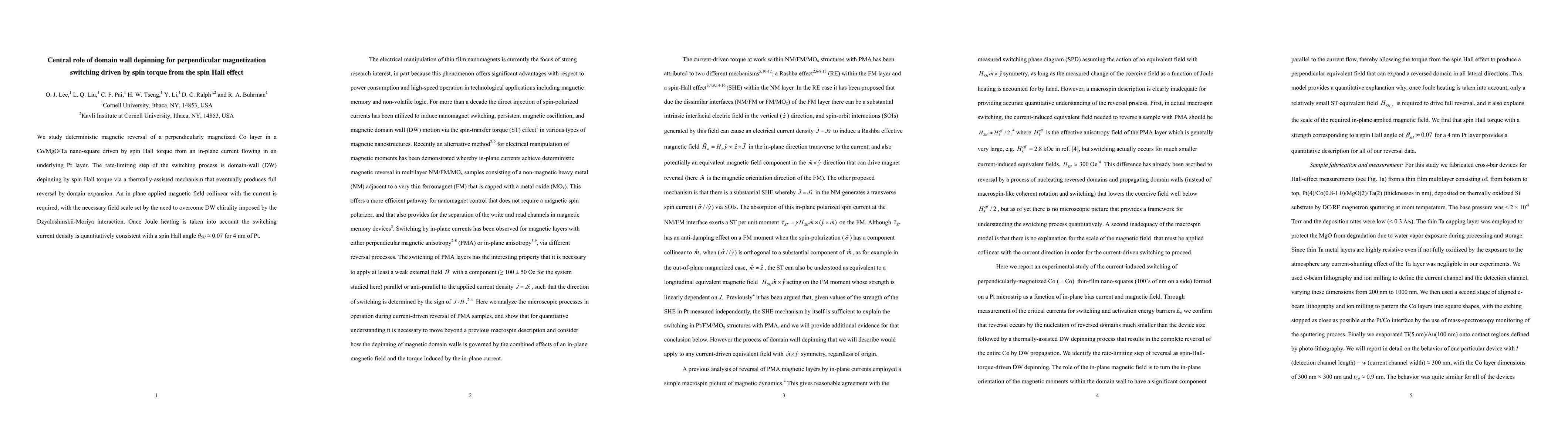 This paper investigates the magnetic reversal in a Co/MgO/Ta nanostructure driven by spin Hall torque from an in-plane current in Pt, finding that domain wall depinning via a thermally-assisted mechanism is the rate-limiting step, requiring an in-plane magnetic field to overcome DW chirality effects. The calculated spin Hall angle for 4 nm Pt is approximately 0.07.