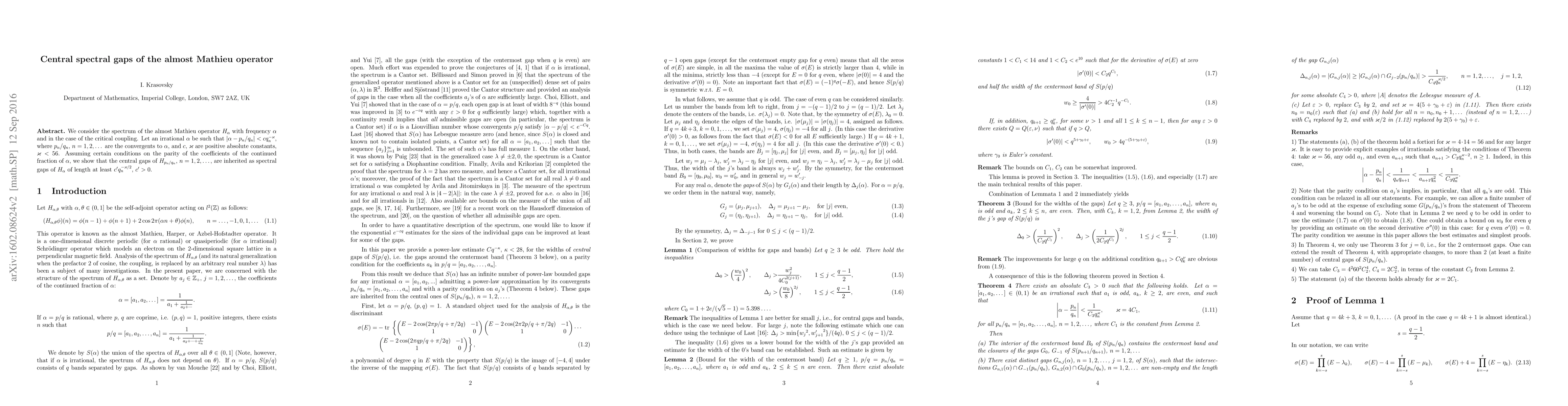 This paper investigates the central spectral gaps of the almost Mathieu operator $H_\alpha$ under critical coupling conditions. It demonstrates that under certain conditions on the coefficients of the continued fraction of $\alpha$, the central spectral gaps of $H_{p_n/q_n}$ are inherited as spectral gaps of $H_\alpha$ with a lower bound length.