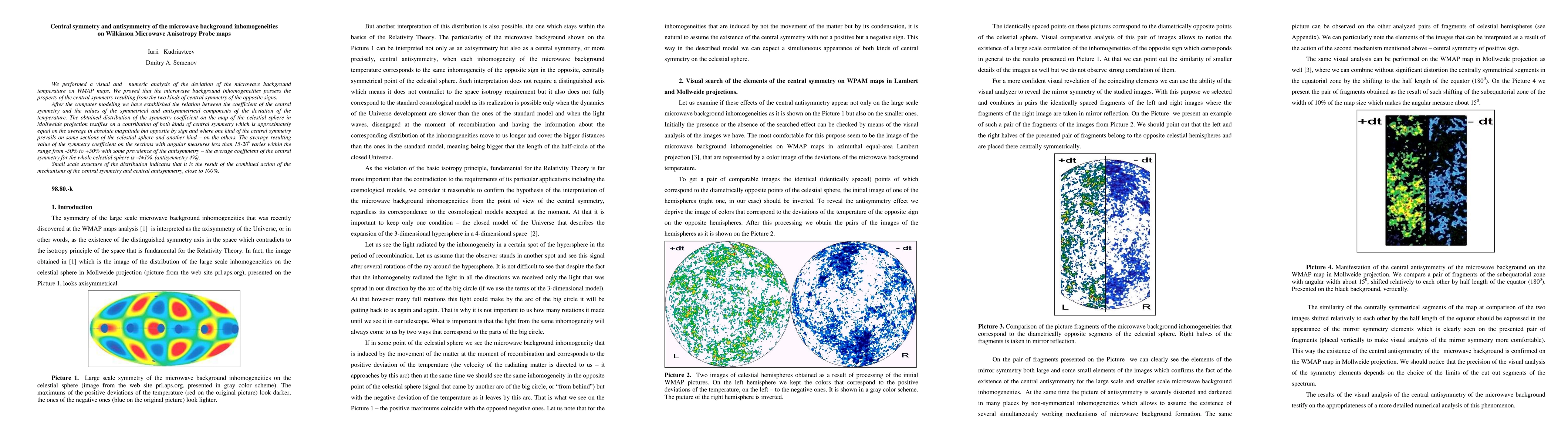 This paper analyzes microwave background temperature inhomogeneities on WMAP maps, demonstrating that they exhibit central symmetry and antisymmetry. The study finds that both types of symmetry contribute nearly equally but oppositely, with antisymmetry slightly prevailing on average.