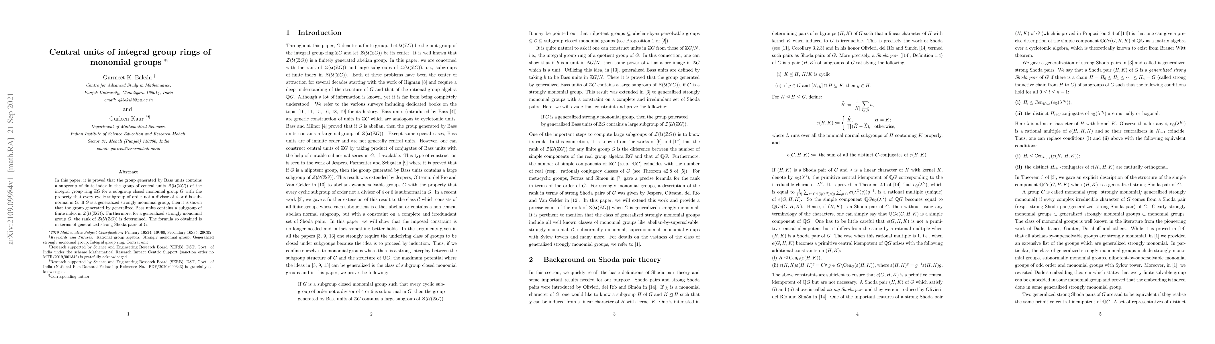 This paper proves that the group generated by Bass units contains a subgroup of finite index in the central units of the integral group ring $\mathbb{Z}G$ for certain monomial groups, and determines the rank of these central units in terms of generalized strong Shoda pairs for generalized strongly monomial groups.