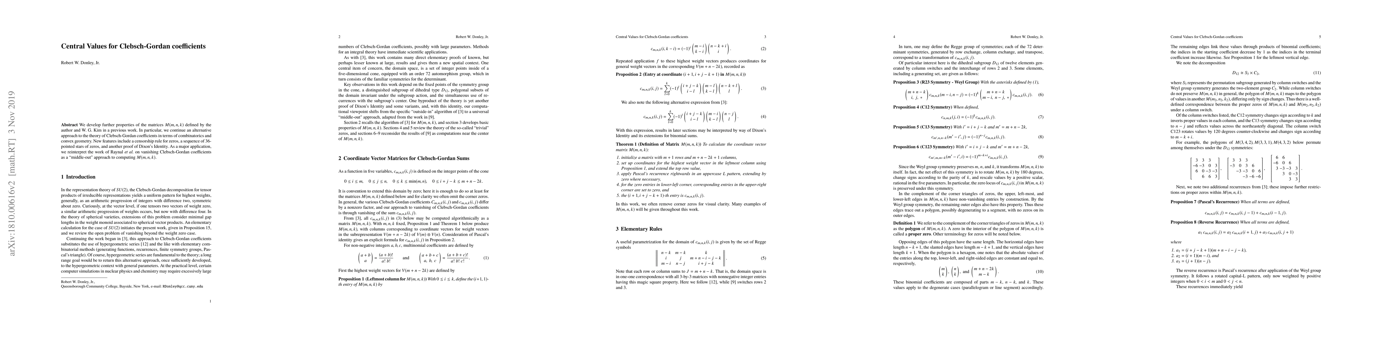 We develop further properties of the matrices $M(m, n, k)$ defined by the author and W. G. Kim in a previous work. In particular, we continue an alternative approach to the theory of Clebsch-Gordan coefficients in terms of combinatorics and convex geometry. New features include a censorship rule for zeros, a sequence of 36-pointed stars of zeros, and another proof of Dixon's Identity. As a major application, we reinterpret the work of Raynal {\it et al.} on vanishing Clebsch-Gordan coefficients as a "middle-out" approach to computing $M(m, n, k).$