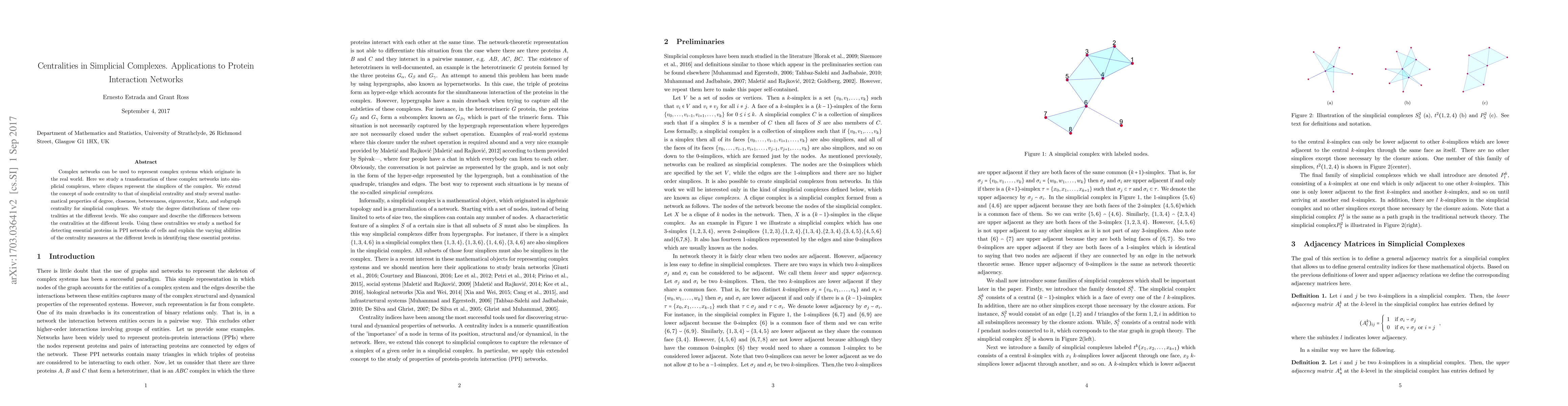 Complex networks can be used to represent complex systems which originate in the real world. Here we study a transformation of these complex networks into simplicial complexes, where cliques represent the simplices of the complex. We extend the concept of node centrality to that of simplicial centrality and study several mathematical properties of degree, closeness, betweenness, eigenvector, Katz, and subgraph centrality for simplicial complexes. We study the degree distributions of these centralities at the different levels. We also compare and describe the differences between the centralities at the different levels. Using these centralities we study a method for detecting essential proteins in PPI networks of cells and explain the varying abilities of the centrality measures at the different levels in identifying these essential proteins. The paper is written in a self-contained way, such that it can be used by practitioners of network theory as a basis for further developments.