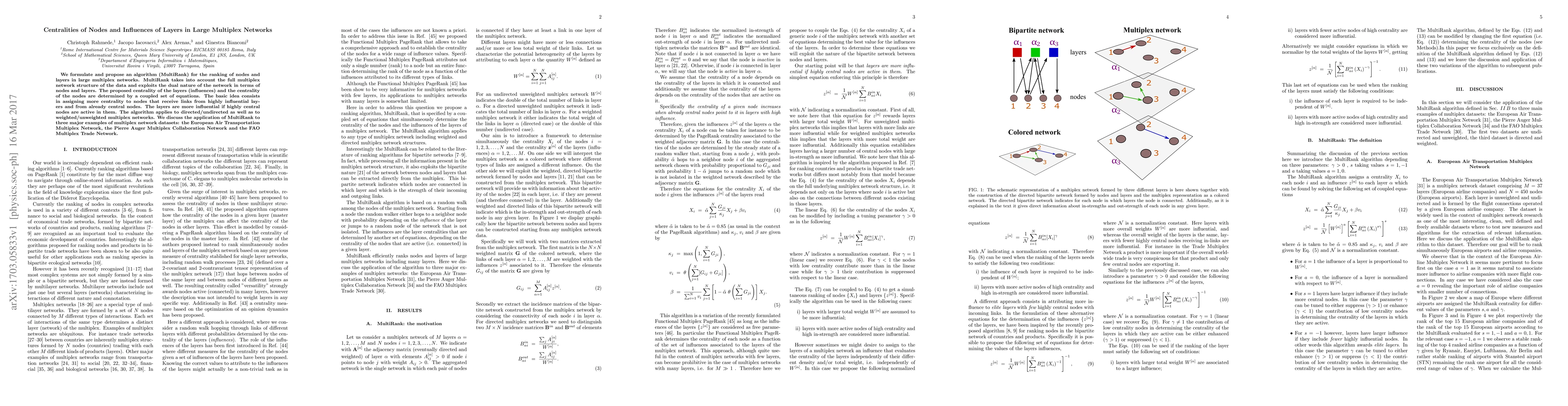 This paper presents an algorithm called MultiRank for ranking nodes and layers in large multiplex networks, considering both the network's structure and the dual nature of nodes and layers. The algorithm determines centrality based on the influence of nodes and layers through a coupled set of equations, and it applies to various types of multiplex networks.