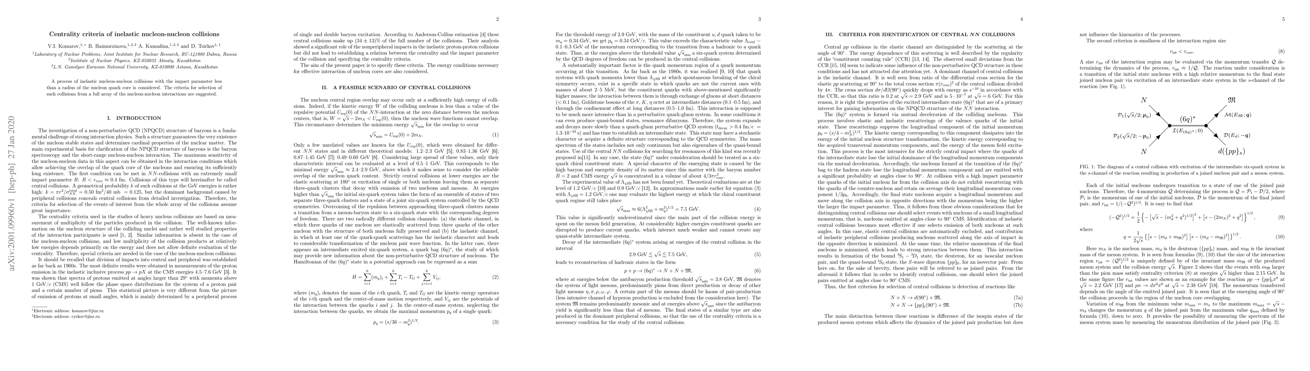 This paper proposes criteria for identifying inelastic nucleon-nucleon collisions where the impact parameter is within the radius of the nucleon's quark core, offering a method to select these specific interactions from a broader range of nucleon-nucleon interactions.