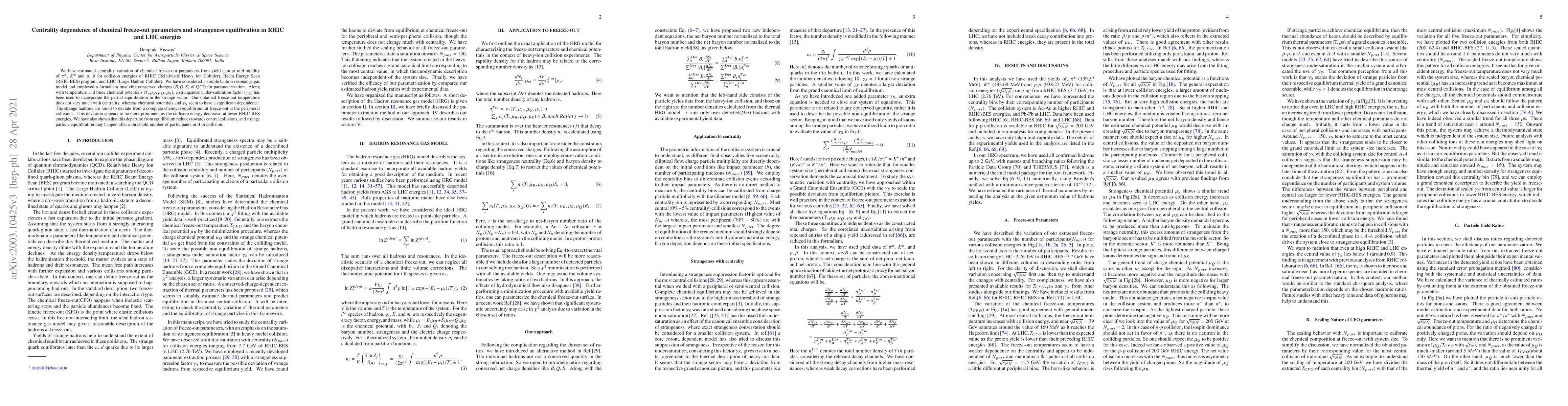 This study investigates the centrality dependence of chemical freeze-out parameters and strangeness equilibration in heavy-ion collisions at RHIC and LHC energies. Results show that while freeze-out temperature remains relatively constant, chemical potentials and strangeness equilibration factors vary significantly with collision centrality, indicating incomplete strangeness equilibration in peripheral collisions, especially at lower energies.