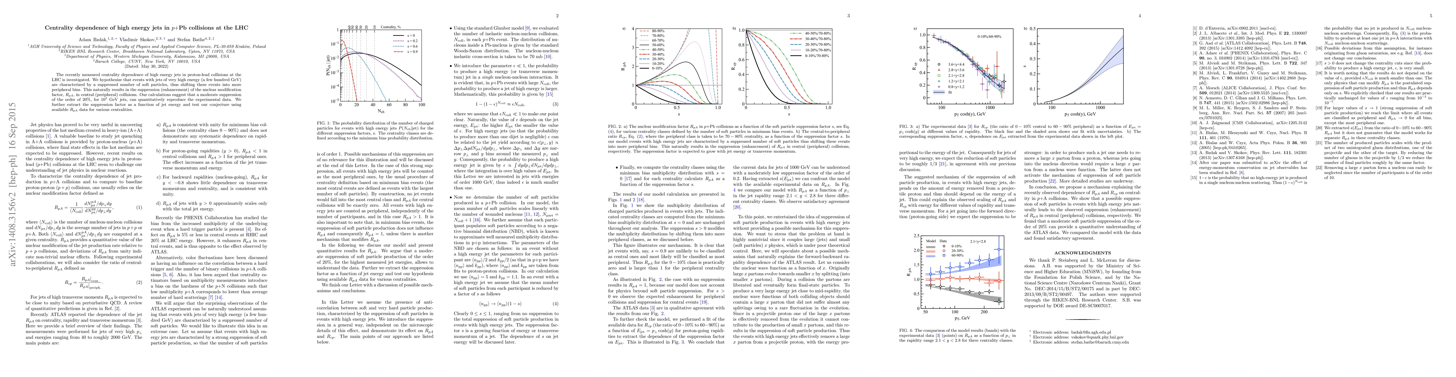 The recently measured centrality dependence of high energy jets in proton-lead collisions at the LHC is investigated. We hypothesize that events with jets of very high energy (a few hundred GeV) are characterized by a suppressed number of soft particles, thus shifting these events into more peripheral bins. This naturally results in the suppression (enhancement) of the nuclear modification factor, $R_{pA}$, in central (peripheral) collisions. Our calculations suggest that a moderate suppression of the order of $20\%$, for $10^{3}$ GeV jets, can quantitatively reproduce the experimental data. We further extract the suppression factor as a function of jet energy and test our conjecture using available $R_{pA}$ data for various centralities.