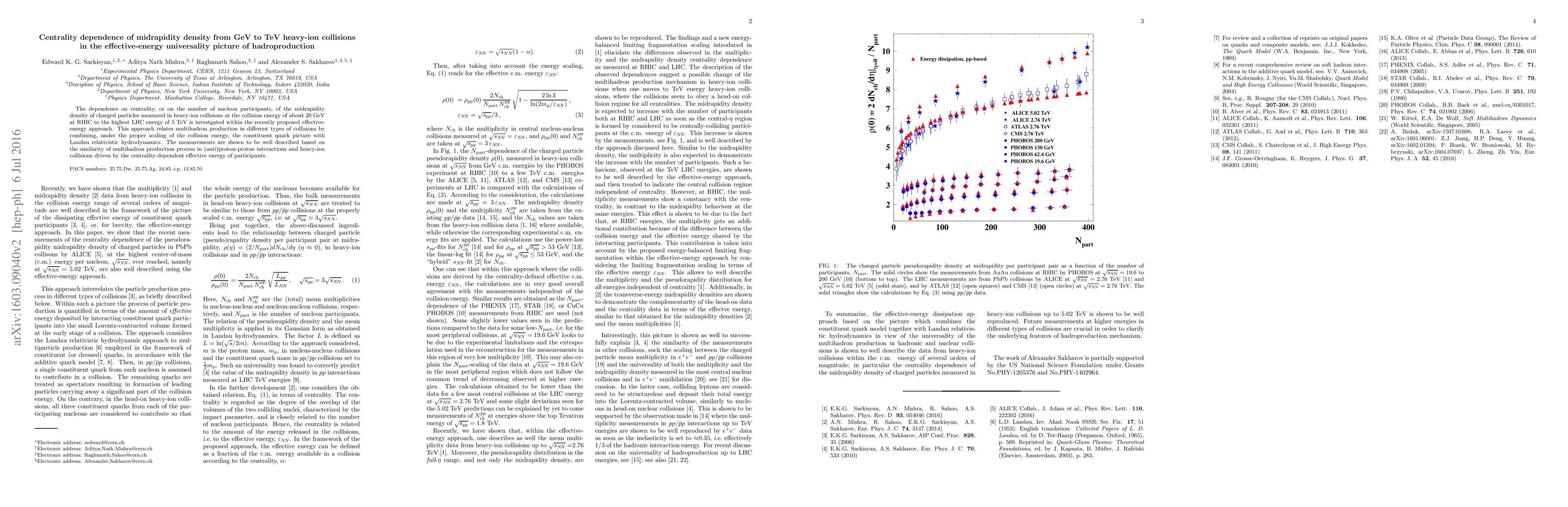 The dependence on centrality, or on the number of nucleon participants, of the midrapidity density of charged particles measured in heavy-ion collisions at the collision energy of about 20 GeV at RHIC to the highest LHC energy of 5 TeV is investigated within the recently proposed effective-energy approach. This approach relates multihadron production in different types of collisions by combining, under the proper scaling of the collision energy, the constituent quark picture with Landau relativistic hydrodynamics. The measurements are shown to be well described based on the similarity of multihadron production process in (anti)proton-proton interactions and heavy-ion collisions driven by the centrality-dependent effective energy of participants.