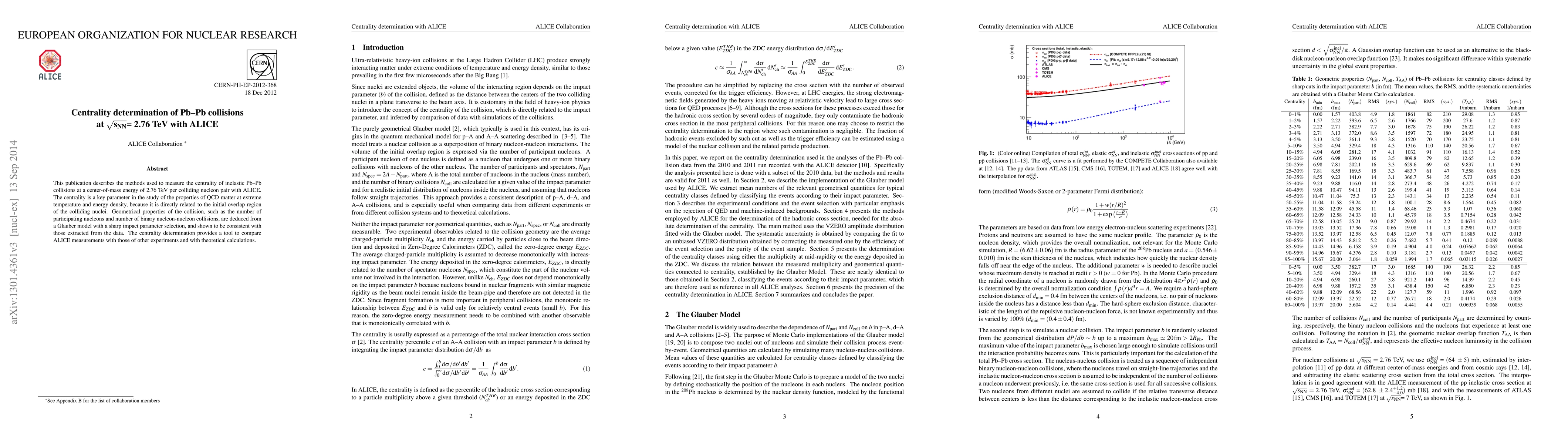 This publication describes the methods used to measure the centrality of inelastic Pb-Pb collisions at a center-of-mass energy of 2.76 TeV per colliding nucleon pair with ALICE. The centrality is a key parameter in the study of the properties of QCD matter at extreme temperature and energy density, because it is directly related to the initial overlap region of the colliding nuclei. Geometrical properties of the collision, such as the number of participating nucleons and number of binary nucleon-nucleon collisions, are deduced from a Glauber model with a sharp impact parameter selection, and shown to be consistent with those extracted from the data. The centrality determination provides a tool to compare ALICE measurements with those of other experiments and with theoretical calculations.