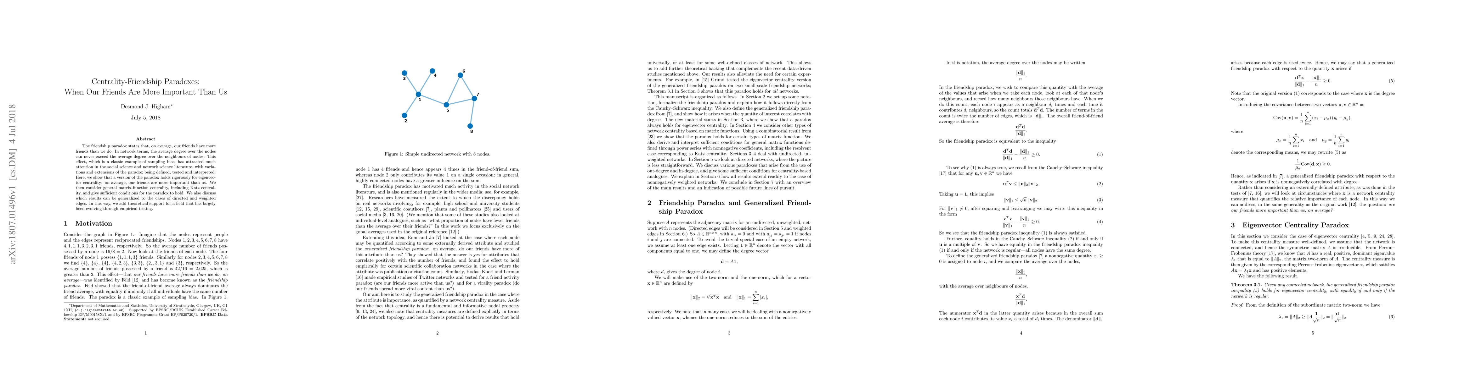 The friendship paradox reveals that, on average, our friends have more friends than we do, which extends to centrality measures like eigenvector centrality where friends are more important. This paradox holds under specific conditions for various centrality metrics, including Katz centrality, and can be generalized to directed and weighted networks.