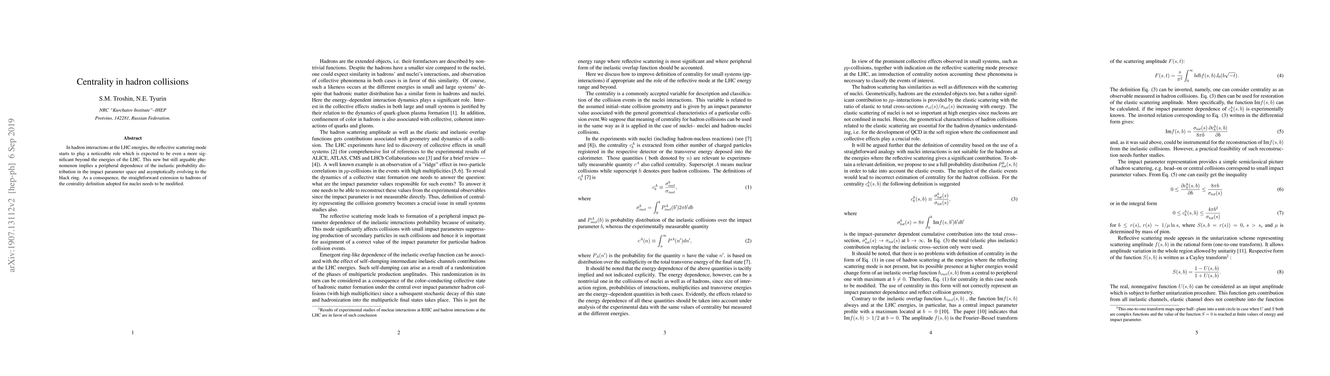 Researchers found that at high energies in hadron collisions, a new phenomenon called reflective scattering becomes significant, affecting how likely particles are to collide in the center of the collision. This discovery requires a modification of the traditional centrality definition used for nuclei.
