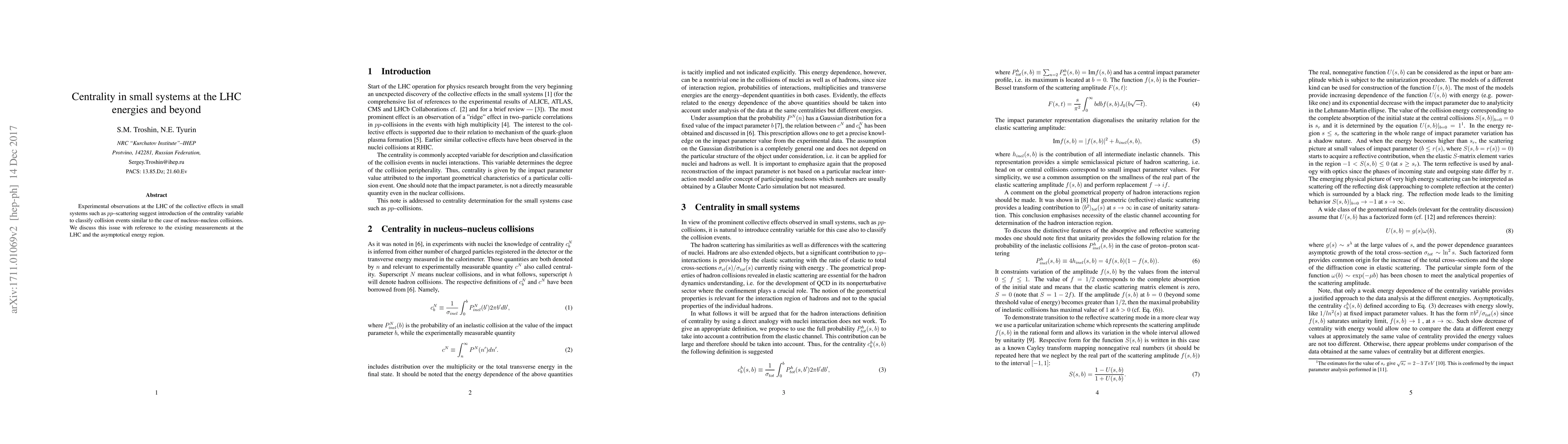 Experimental observations at the LHC of the collective effects in small systems such as $pp$--scattering suggest introduction of the centrality variable to classify collision events similar to the case of nucleus--nucleus collisions. We discuss this issue with reference to the existing measurements at the LHC and the asymptotical energy region.