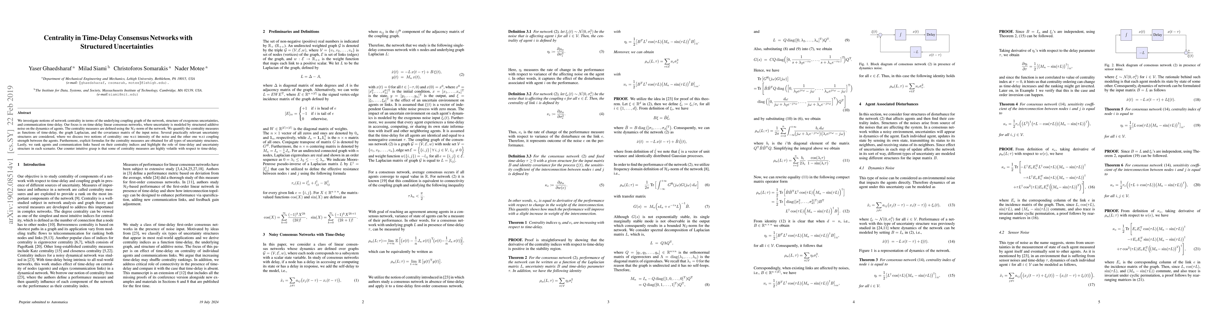 We investigate notions of network centrality in terms of the underlying coupling graph of the network, structure of exogenous uncertainties, and communication time-delay. Our focus is on time-delay linear consensus networks, where uncertainty is modeled by structured additive noise on the dynamics of agents. The centrality measures are defined using the $\mathcal H_2$-norm of the network. We quantify the centrality measures as functions of time-delay, the graph Laplacian, and the covariance matrix of the input noise. Several practically relevant uncertainty structures are considered, where we discuss two notions of centrality: one w.r.t intensity of the noise and the other one w.r.t coupling strength between the agents. Furthermore, explicit formulas for the centrality measures are obtained for all types of uncertainty structures. Lastly, we rank agents and communication links based on their centrality indices and highlight the role of time-delay and uncertainty structure in each scenario. Our counter intuitive grasp is that some of centrality measures are highly volatile with respect to time-delay.
