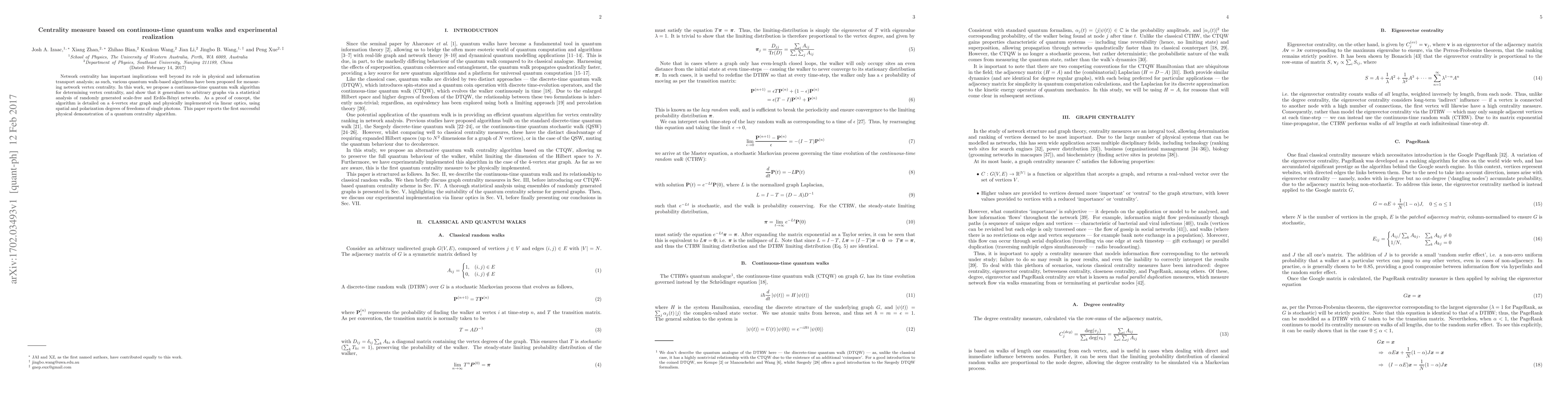This paper proposes a continuous-time quantum walk algorithm for calculating network vertex centrality, demonstrating its generalization across different graph types. The algorithm is physically realized using linear optics with single photons, marking the first successful demonstration of a quantum centrality measurement.