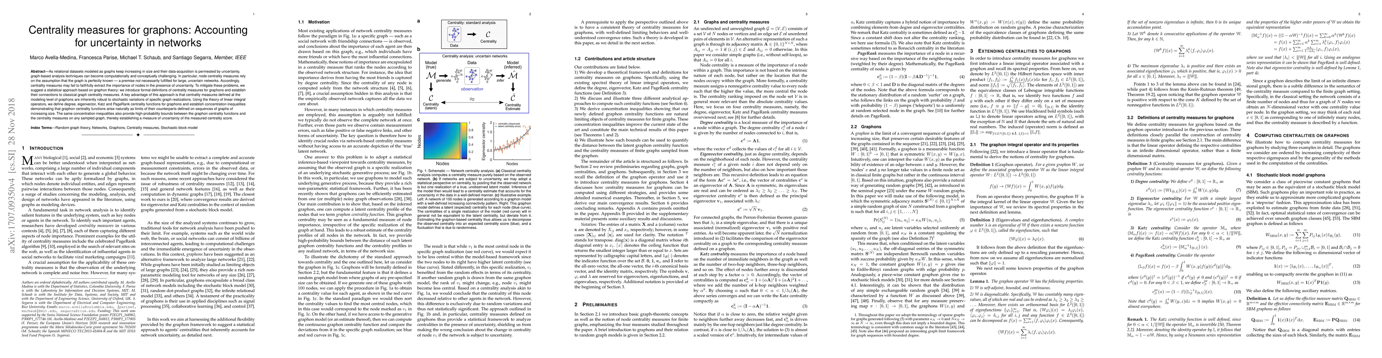 This paper proposes statistical centrality measures for graphons to address the challenges of uncertainty in large relational datasets. It introduces formal definitions for degree, eigenvector, Katz, and PageRank centrality functions for graphons, demonstrating their robustness to stochastic variations and establishing concentration inequalities to quantify uncertainty in centrality scores derived from sampled graphs.