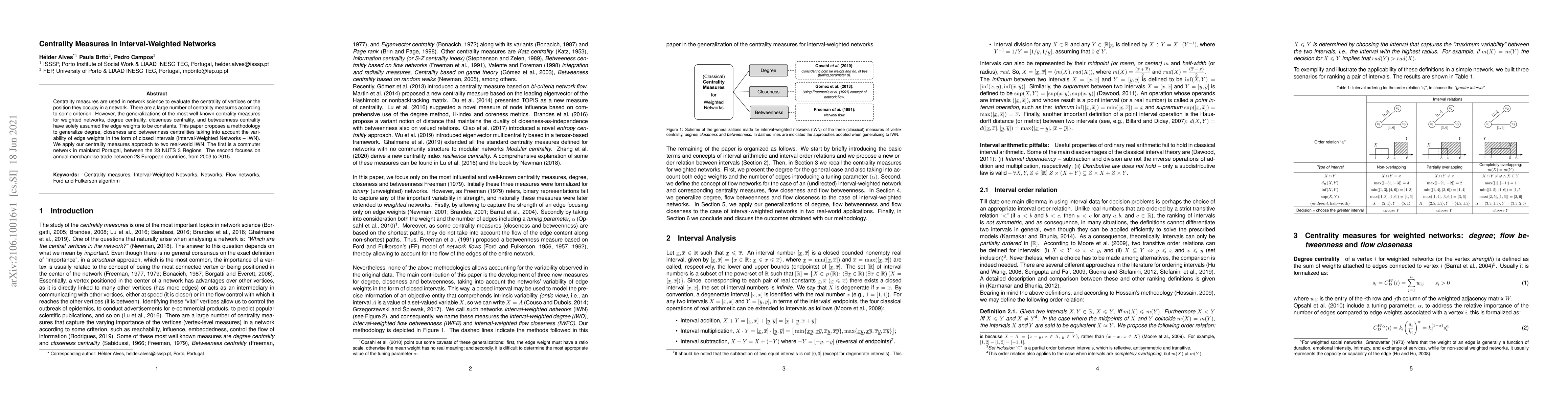 This paper proposes methodologies to generalize degree, closeness, and betweenness centralities for interval-weighted networks, where edge weights are represented as closed intervals. The approach is applied to real-world networks, including a commuter network in Portugal and a merchandise trade network between European countries.