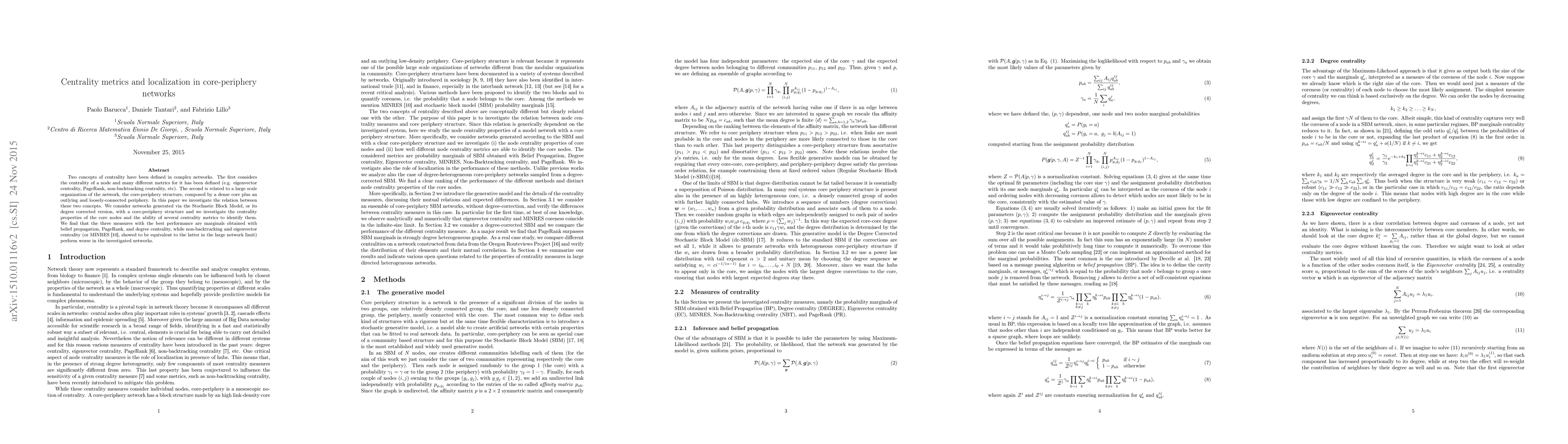 The study investigates centrality metrics in core-periphery networks generated via the Stochastic Block Model or its degree-corrected version, focusing on the performance of various centrality measures in identifying core nodes.