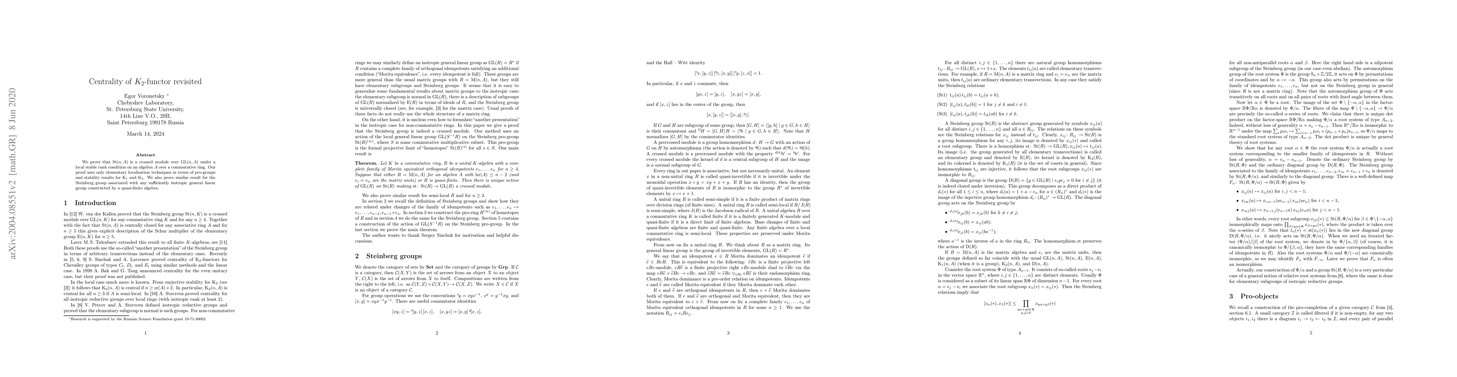 We prove that $\mathrm{St}(n, A)$ is a crossed module over $\mathrm{GL}(n, A)$ under a local stable rank condition on an algebra $A$ over a commutative ring. Our proof uses only elementary localization techniques in terms of pro-groups and stability results for $\mathrm K_1$ and $\mathrm K_2$. We also prove similar result for the Steinberg group associated with any sufficiently isotropic general linear group constructed by a quasi-finite algebra.