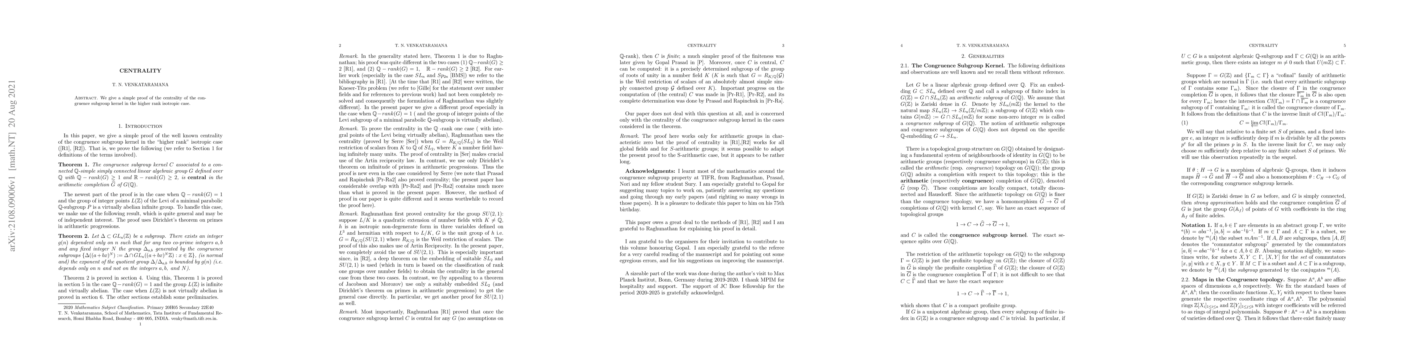 We give here a simple proof of the centrality of the congruence subgroup kernel in the higher rank isotropic case.