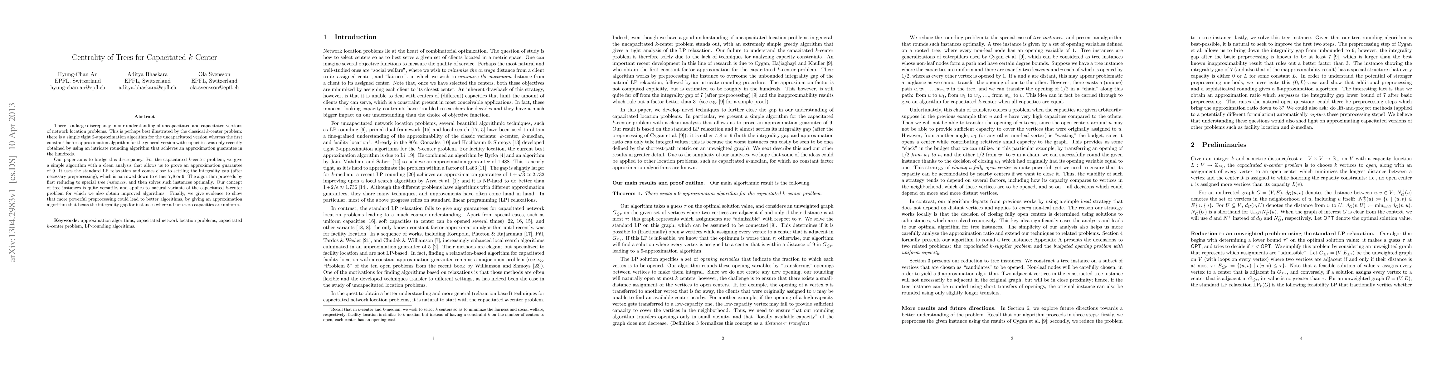 This paper presents a simple algorithm for the capacitated k-center problem with a 9-approximation guarantee, leveraging LP relaxation and preprocessing. It reduces the problem to tree instances, solving them optimally and narrowing the integrality gap to 7, 8, or 9.