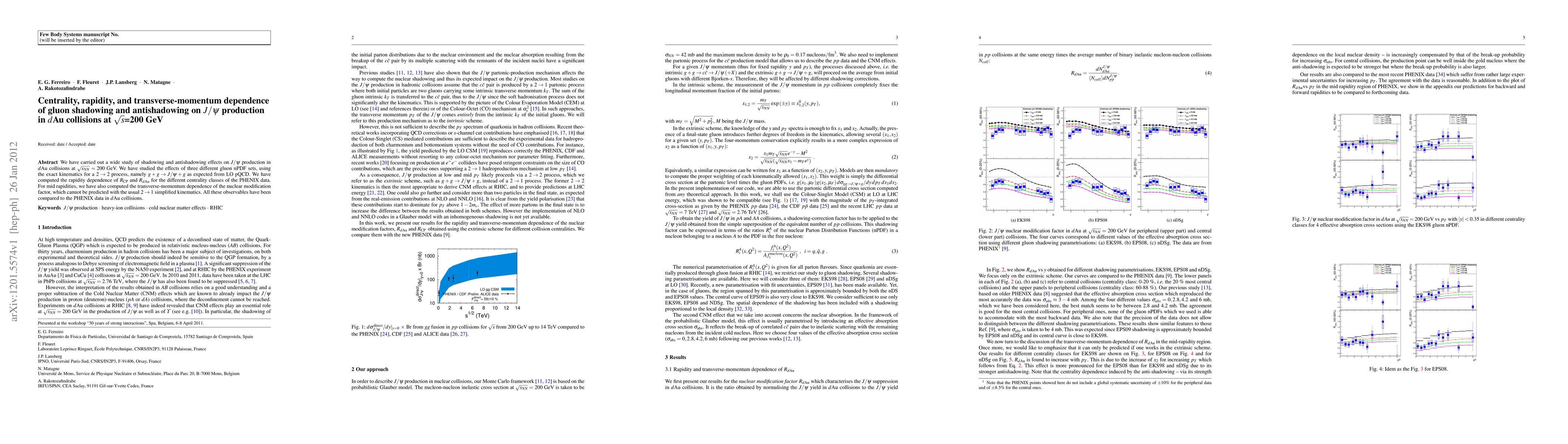 We have carried out a wide study of shadowing and antishadowing effects on \jpsi\ production in \dAu\ collisions at $\sqrt{s_{NN}}=200$ GeV. We have studied the effects of three different gluon nPDF sets, using the exact kinematics for a $2\to 2$ process, namely $g+g\to J/\psi+g$ as expected from LO pQCD. We have computed the rapidity dependence of \RCP\ and $R_{d\rm Au}$ for the different centrality classes of the PHENIX data. For mid rapidities, we have also computed the transverse-momentum dependence of the nuclear modification factor, which cannot be predicted with the usual $2\to 1$ simplified kinematics. All these observables have been compared to the PHENIX data in \dAu\ collisions.
