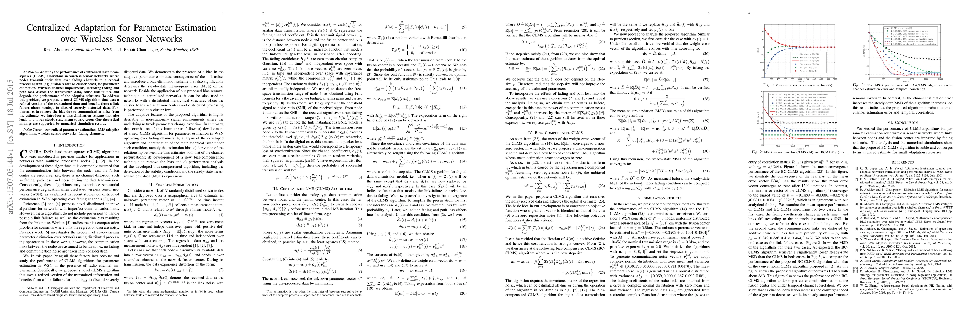 This paper proposes a novel centralized least mean-squares (CLMS) algorithm for parameter estimation in wireless sensor networks, addressing channel impairments through a refined data transmission and a link failure alarm strategy. It also introduces a bias-elimination scheme to reduce mean-square error, supported by theoretical and numerical simulations.