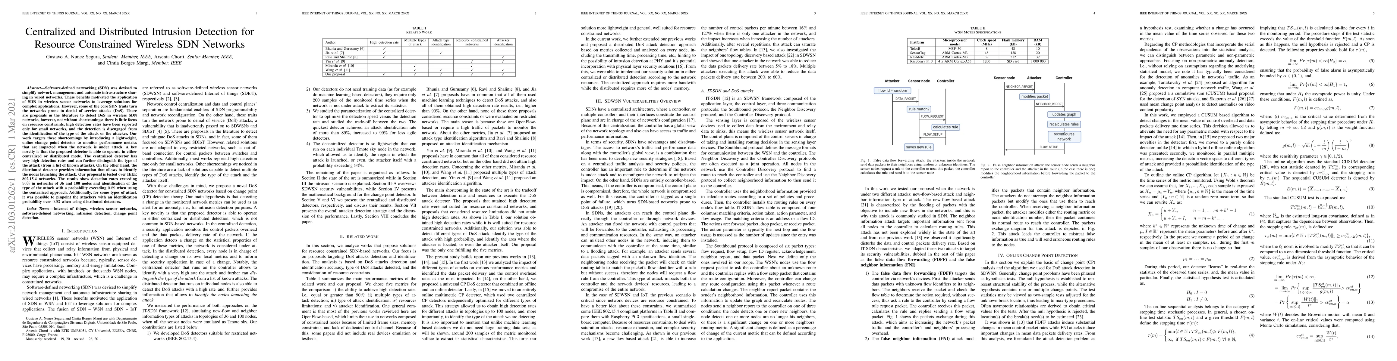This paper proposes a lightweight intrusion detection system for resource-constrained wireless SDN networks, capable of operating in both centralized and distributed modes. The centralized detector achieves high detection rates and can identify attack types, while the distributed detector can pinpoint attacker nodes, demonstrating effectiveness in IEEE 802.15.4 networks with detection rates over 96% and attack identification probabilities exceeding 89%.