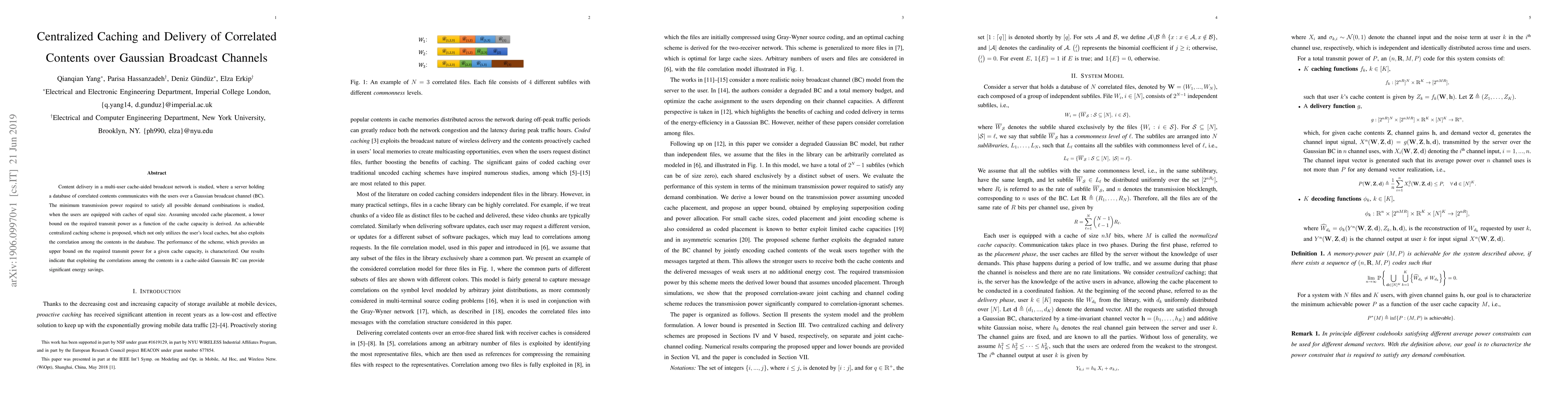 This paper explores centralized caching strategies for delivering correlated contents over Gaussian broadcast channels in multi-user networks. It proposes a caching scheme that leverages content correlations to minimize transmission power, deriving a lower bound and characterizing an achievable upper bound on power requirements.